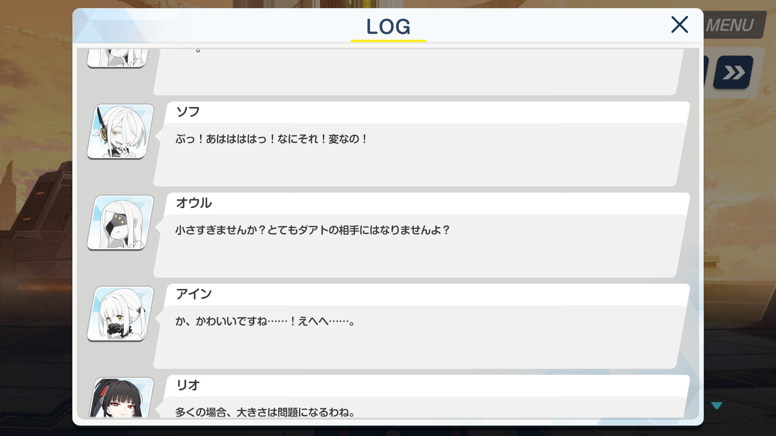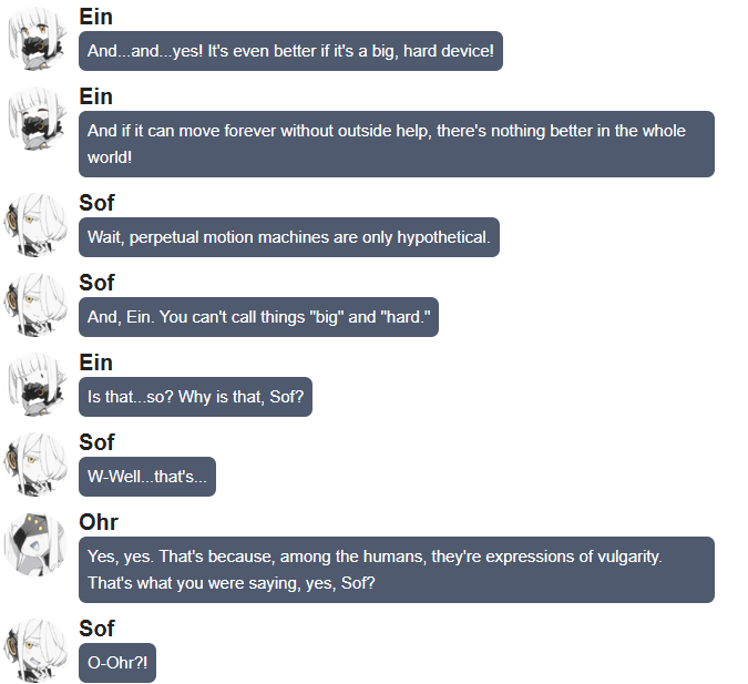 This is 100% a dick joke.>Sof: Pff! Ahahahaha! What is that!? So weird!>Ohr: Isn't it too small? It won't match up to Daath at all>Ein: I-It sure is cute...! Ehehe...>Rio: In most cases, size doesn't matter.