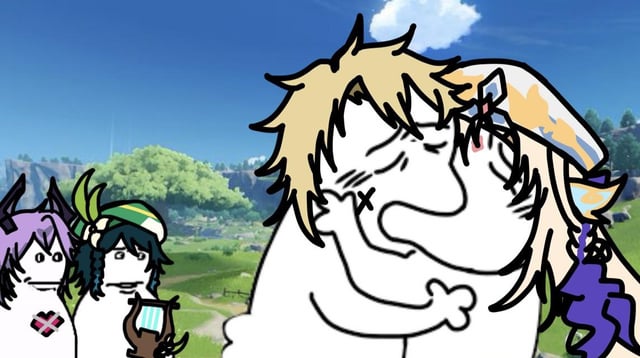 >>555374250>>555374436I would take any of these over him losing desu. One is generic Genshin slop "let's all be friends and fight the evil abyss" and the other is hilarious like Daily Lives of High School Boys type shit.