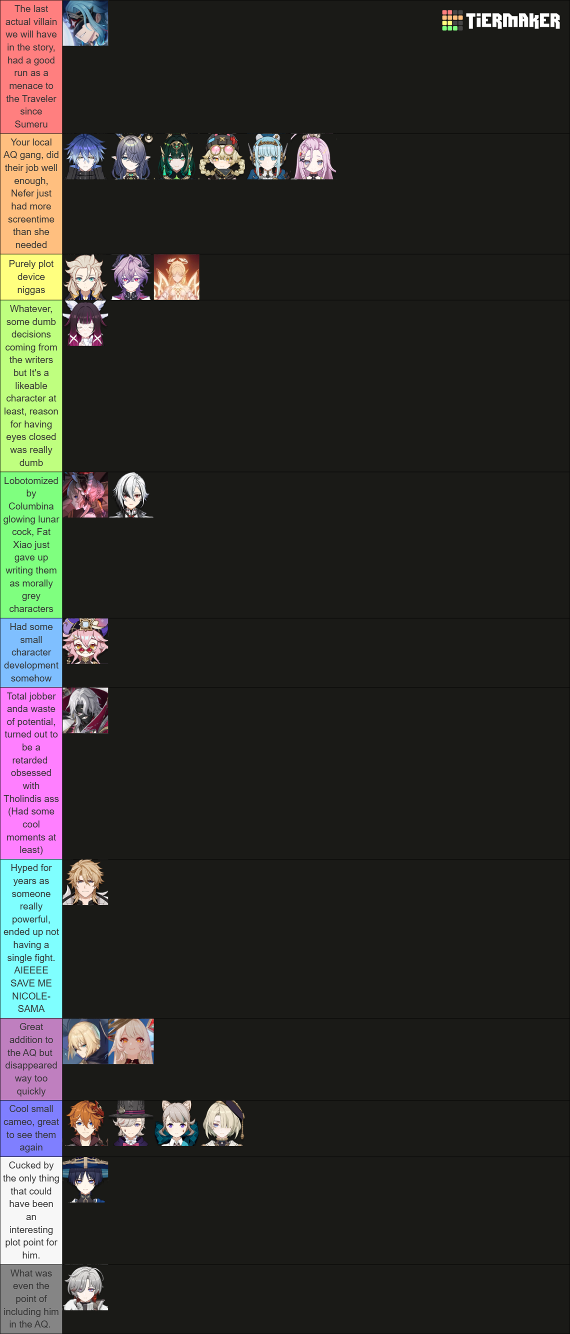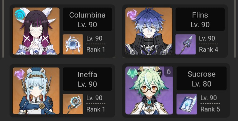 Mona+Fischl > Eula+Amber > Jean+LisaGanyu+Keqing > Ningguang+Beidou > HuTao+XianglingYae+Raiden > Ayaka+LumineDehya+Dunyarzad...Navia+Clorinde > Arlecchino+Furina > Chevreuse+ChioriCitlali+Lumine > Mavuika+XilonenIneffa+Jahoda > Sandrone+Columbina > Lauma+NeferThis is the word of God