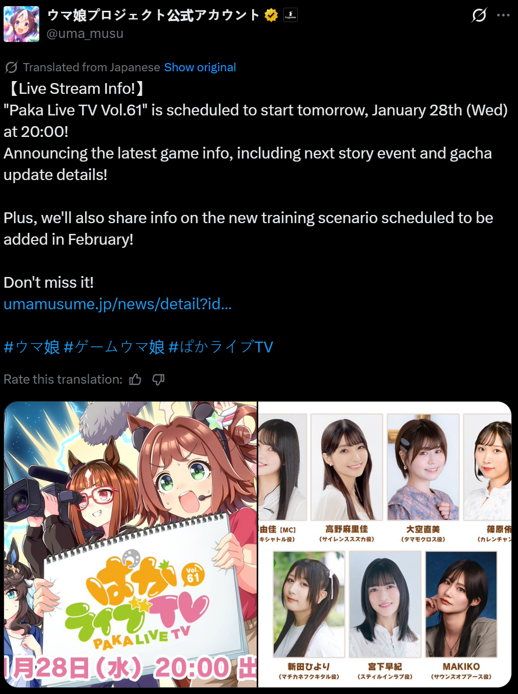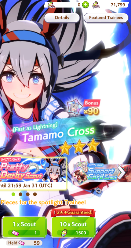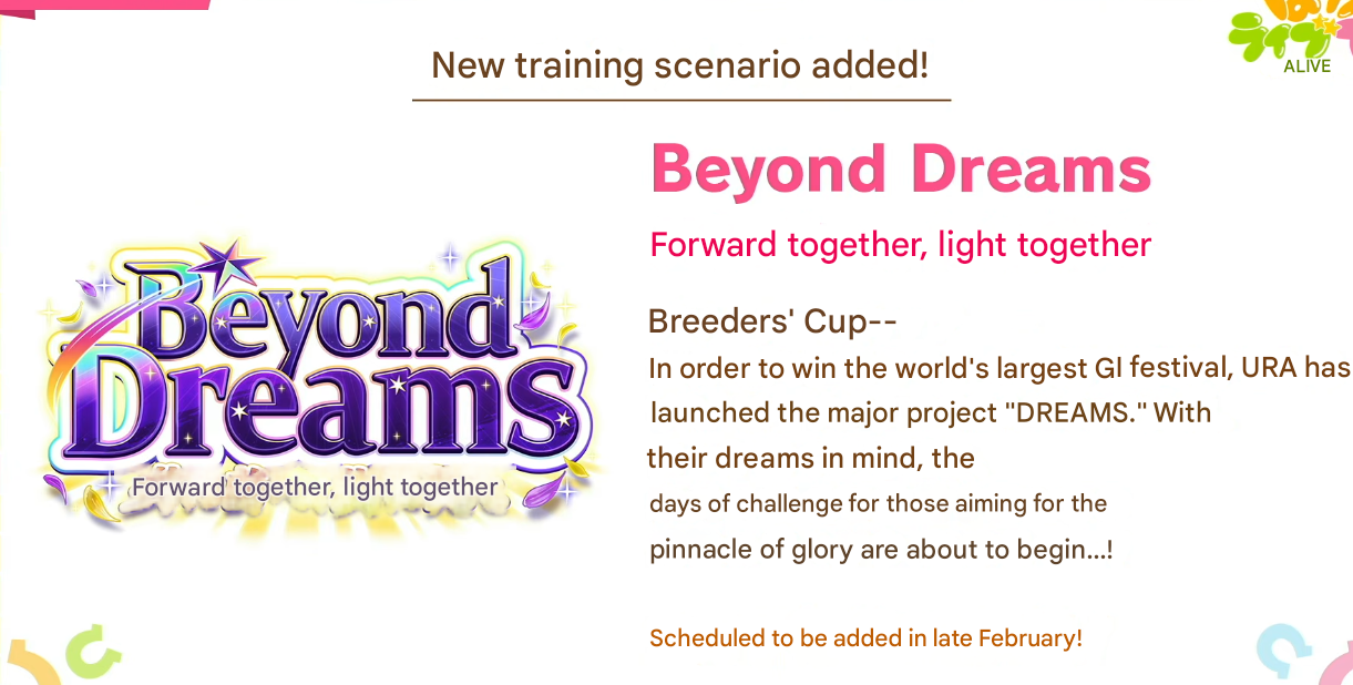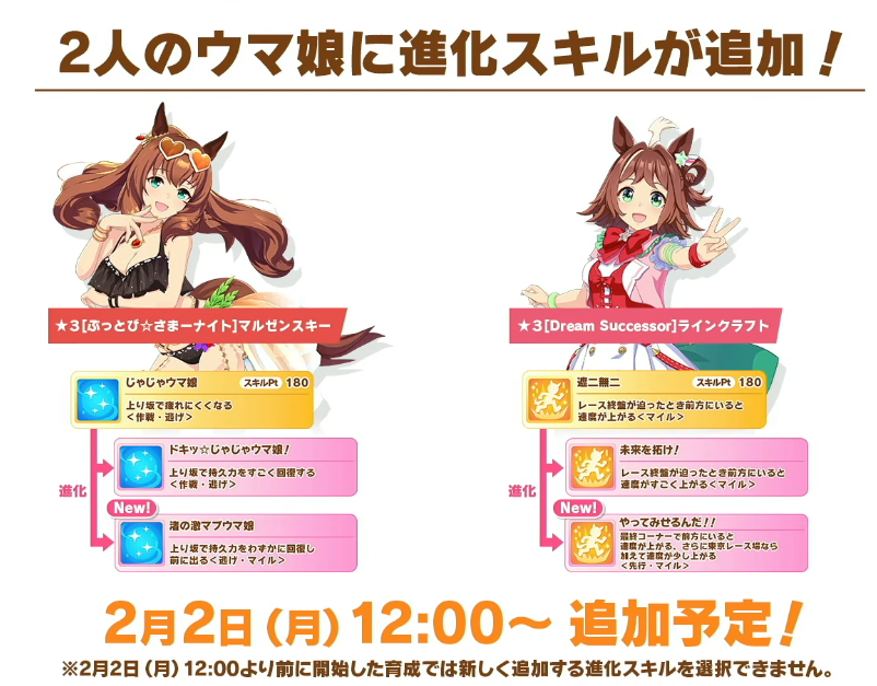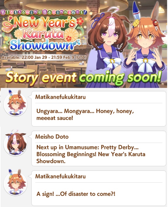 Previous: >>555419554>Global Game NewsLink your account to Cygames iDCurrent Scenario: Aoharu Hai aka "Unity Cup"Current Rate Up Trainee: Fine Motion (3*), Tamamo Cross (3*)Current Rate Up Support Cards: Manhattan Cafe (SSR), Inari One (SR), Nice Nature (SSR), Oguri Cap (as in peak SSR)Current CM: Sagittarius Cup - Nakayama Turf 2500mMain Story Chapter 5 is out01/27 - New Beginnings Part 101/29 - NY Opera & Haru 3*+Fuku SSR+Ayabe SSRMid February - Capricorn Cup - Chukyo Turf 1200mhttps://umamusume.com/news/100040/https://pages.snep.pw/uma/anni-skill-changes/>JP Game NewsCurrent Rate Up: Kiseki (3*), Support Card Select Pick UpNew Scenario "Yukoma Hot Spring" releasedTimeline: https://uma.moe/timelineCygames Webstore: https://webstore.cygames.com/en/umamusume_en/>Thread Clubshttps://rentry.co/umaglobalclublistYou must be E3 (20k points) to join a circle. Apply with /uma/ or /vg/ in your profile or post ID in the thread.>All Guides & Resourceshttps://rentry.org/uma26Game databasehttps://gametora.com/umamusume (Click the gear to switch between JP / global server info)A basic guide for newfagshttps://rentry.org/umaglobalFind networks if your region is blocked from the game or clienthttps://www.umavpn.top/93Seiyuu & Concertshttps://rentry.org/umstUma Texthttps://umareader.idsmile.xyz/10 runs a day in the jar