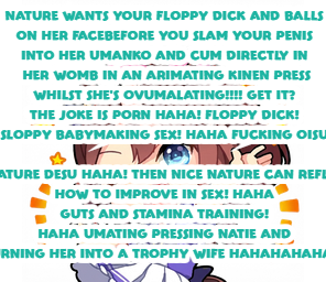 >>555455615>>555454885>>555455005>>555454952NATURE WANTS YOUR FLOPPY DICK AND BALLS ON HER FACE BEFORE YOU SLAM YOUR PENIS INTO HER UMANKO AND CUM DIRECTLY IN HER WOMB IN AN ARIMATING KINEN PRESS WHILST SHE'S OVUMALATING!!!! GET IT? THE JOKE IS PORN HAHA! FLOPPY DICK! SLOPPY BABYMAKING SEX! HAHA FUCKING OISU NICE NATURE DESU HAHA! THEN NICE NATURE CAN REFLECT ON HOW TO IMPROVING IN SEX! HAHA GUTS AND STAMINA TRAINING! HAHA UMATING PRESSING NATIE AND TURNING HER INTO A TROPHY WIFE HAHAHAHAHA!!!!