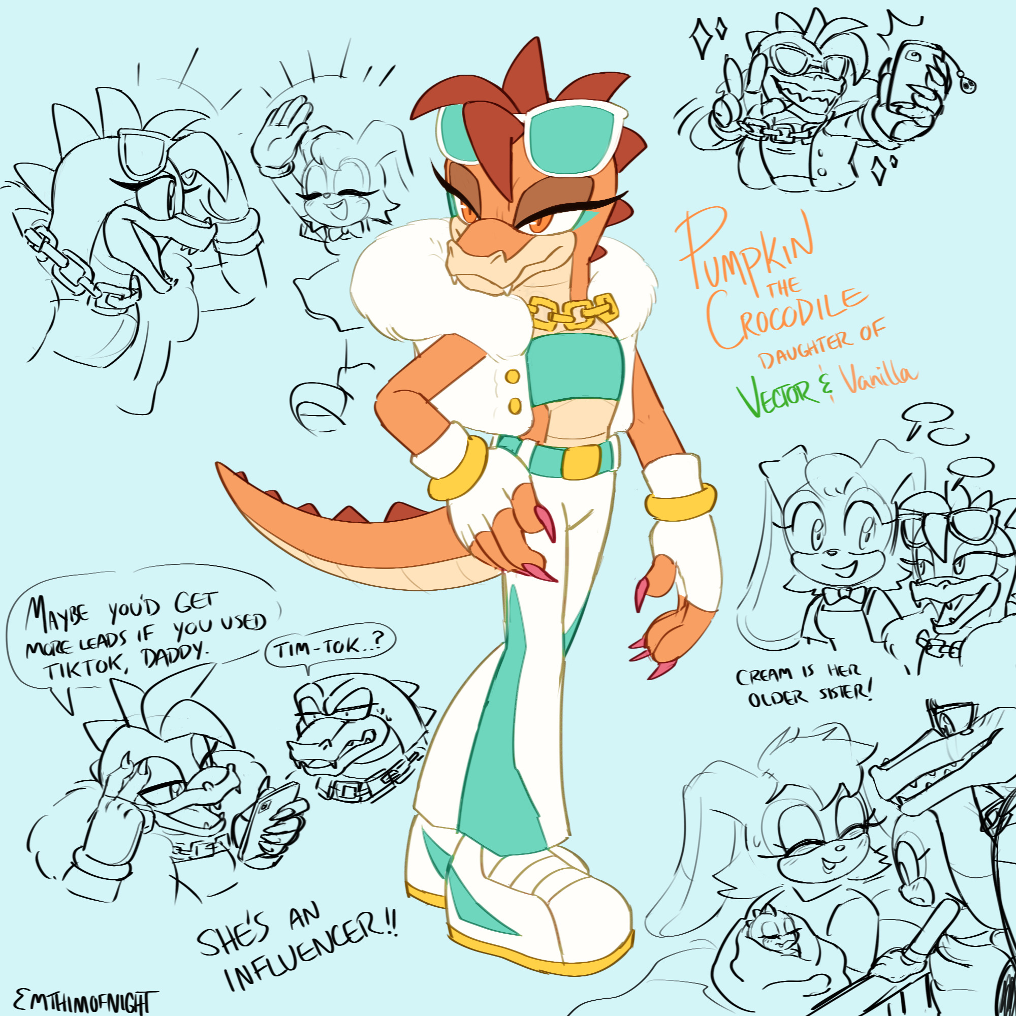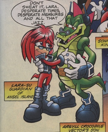 >>555451364>Charmy is a time traveling bee and one of Sonic's rivals in speedIf you take his SoA age seriously then it's just Teen Charmy traveling into the past to help his friends fight Metal, and the Chaotix meet Kid Charmy after this game.>Vector is a skeptical Christian that wants to interrogate God and likes musicHe IS from Christmas Island.>Bomb & Heavy are badnik (Mechanix) defectorsSoA only. SoJ, they're moles.