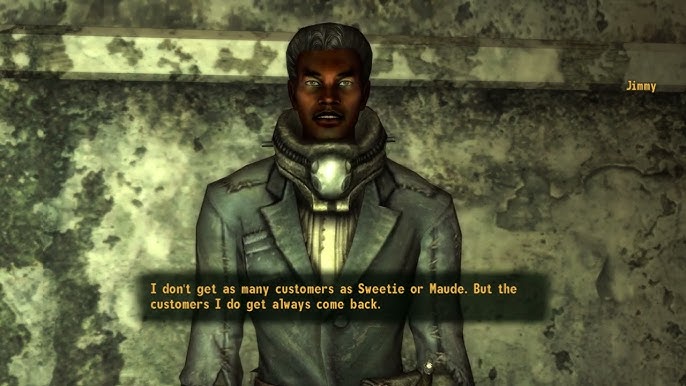 >Jimmy originally lived in a village east of the Colorado River with his parents. At the age of 16, his village was attacked by Caesar's Legion, and his parents were killed as an "example." Jimmy was enslaved and brought to a Legion camp, where he was chosen as a tent servant by a high ranking centurion. The centurion became infatuated with Jimmy and protected him, with Jimmy remarking that he was "gentle, most of the time" and would bring him "little gifts". However, the affair was kept secret, as homosexuality is punishable by death under Caesar's law.[1]>Eventually, rumors began to circulate about the centurion's relationship with Jimmy, and the two were nearly discovered. Ultimately, the centurion chose his position over his feelings, and led Jimmy out into the desert to kill him and remove all evidence of the affair. Realizing he was about to be killed, Jimmy kicked the centurion in the genitals and ran, fleeing through the desert and across the Colorado River. Eventually, he arrived in Westside and began working as a prostitute for Pretty Sarah, specializing in male clients.[1] Exclusively so: While he is very friendly with women,[3] and will even flirt,[4] there are not enough caps in Vegas to make him even consider having sex with a woman.