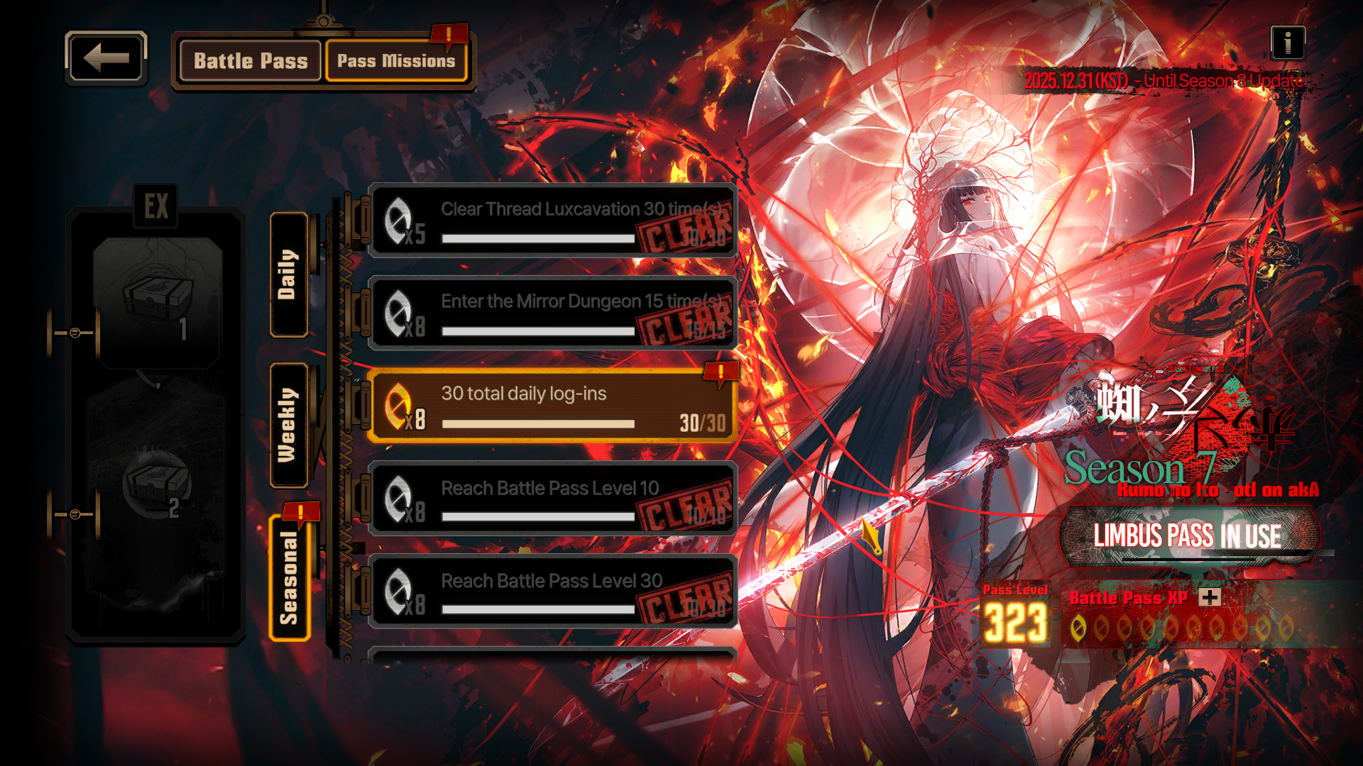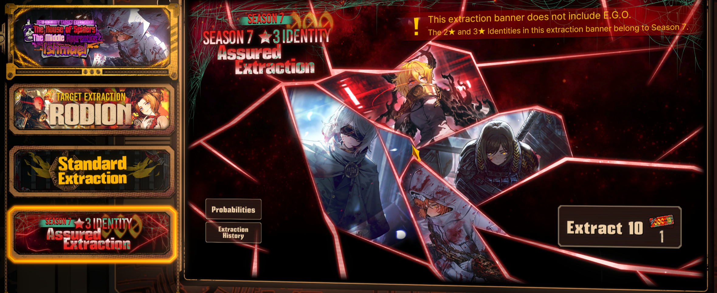 Previous thread: >>555451208MeurtisGOD editionSeason 7 - Kumo no Ito2025.12.31 —Mirror Dungeon #6 - Mirror of Immortality2025.07.03 —Refraction Railway Line 5 - Merry Go Round2025.02.20 —>Current Events>Upcoming Extractions>Current Extractions2026.01.22 — 2026.02.05[000] The House of Spiders: The Middle Apprentice Ishmael2026.01.22 — 2026.02.05Target Extraction: [ Rodion ] ID & E.G.O>FAQs! This game is directly tied to the setting of Project Moon's previous games, Lobotomy Corporation and Library of Ruina, and is set after both. Expect spoilers for those games in this thread.! The tutorial is important.>Download linksAppStore: https://apps.apple.com/app/limbus-company/id6444112366Google Play: https://play.google.com/store/apps/details?id=com.ProjectMoon.LimbusCompanySteam: https://store.steampowered.com/app/1973530/Limbus_Company/>Other linksOfficial twitter: https://twitter.com/limbuscompany_bOfficial youtube: https://www.youtube.com/@ProjectMoonOfficialOfficial site: https://limbuscompany.global>Required readinghttps://mega.nz/folder/xosDkZ5Z#Wt4JpUt5Bb2XG77pxuuXpw>For all your EGO and Sinner info needshttps://limbus.kusoge.xyz/https://gll-fun.com/en/>Useful resources and a general guidehttps://rentry.org/lcg_resourceshttps://rentry.org/lcbguidehttps://rentry.org/LCB_optimal_grind_guidehttps://lcb-days-since-last-id.carrd.co/https://lcb-days-since-last-ego.carrd.co/>Countdownhttps://lcbcountdown.carrd.co/