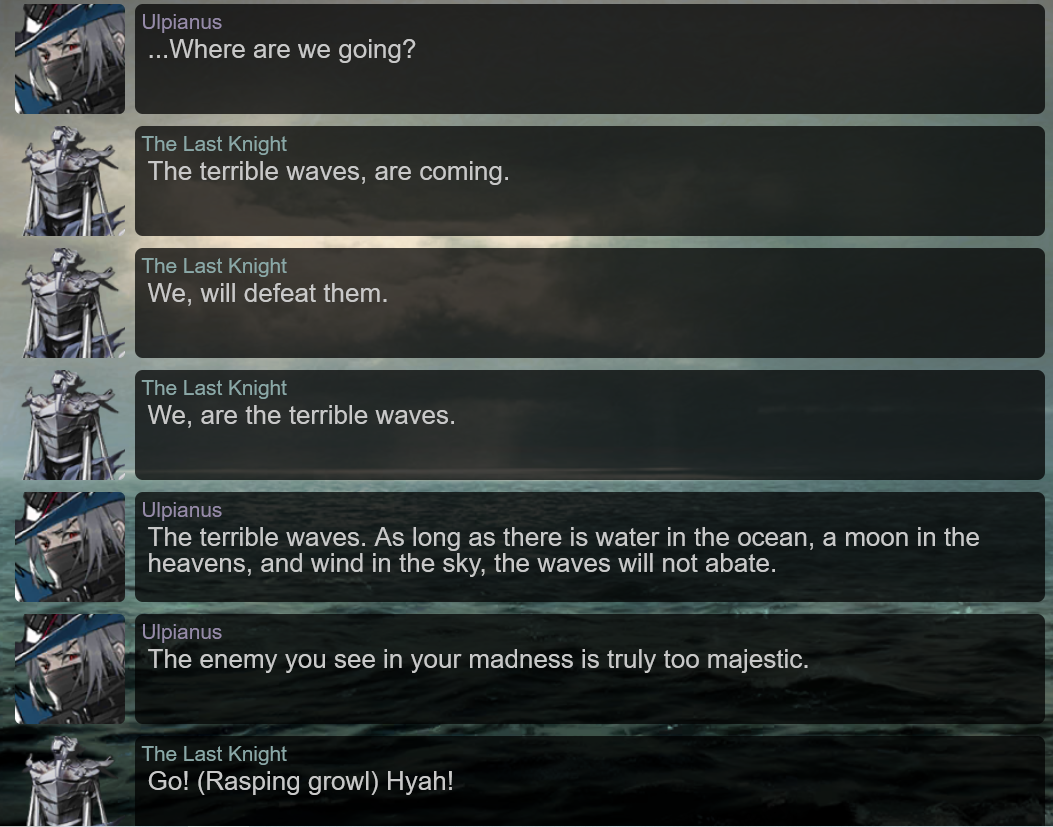 >>555507007That line "The enemy you see in your madness is truly too majestic" is fucking beautiful.