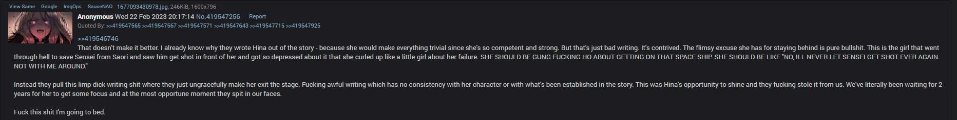 Most of my Hina hate comes from how obnoxious Hinafags always are. If not for Hinafags being by far the worst posters on /bag/ I would purely be ambivalent towards her. but Hinafags constantly acting like whiny attention whores and the most insecure pussies imaginable has brought Hina down to my most disliked character in the entire game.