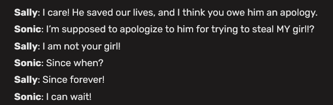 Okay I've had it. Sonallyfags have been defending SatAM as "not as bad" as Archie. I haven't read or watched either so I can't verify it but this interaction is extremely un-Sonic in a way that can't even be defended with "Sonic Adventure didn't come out yet". There is no circumstance where any Sonic from any game acts like this.