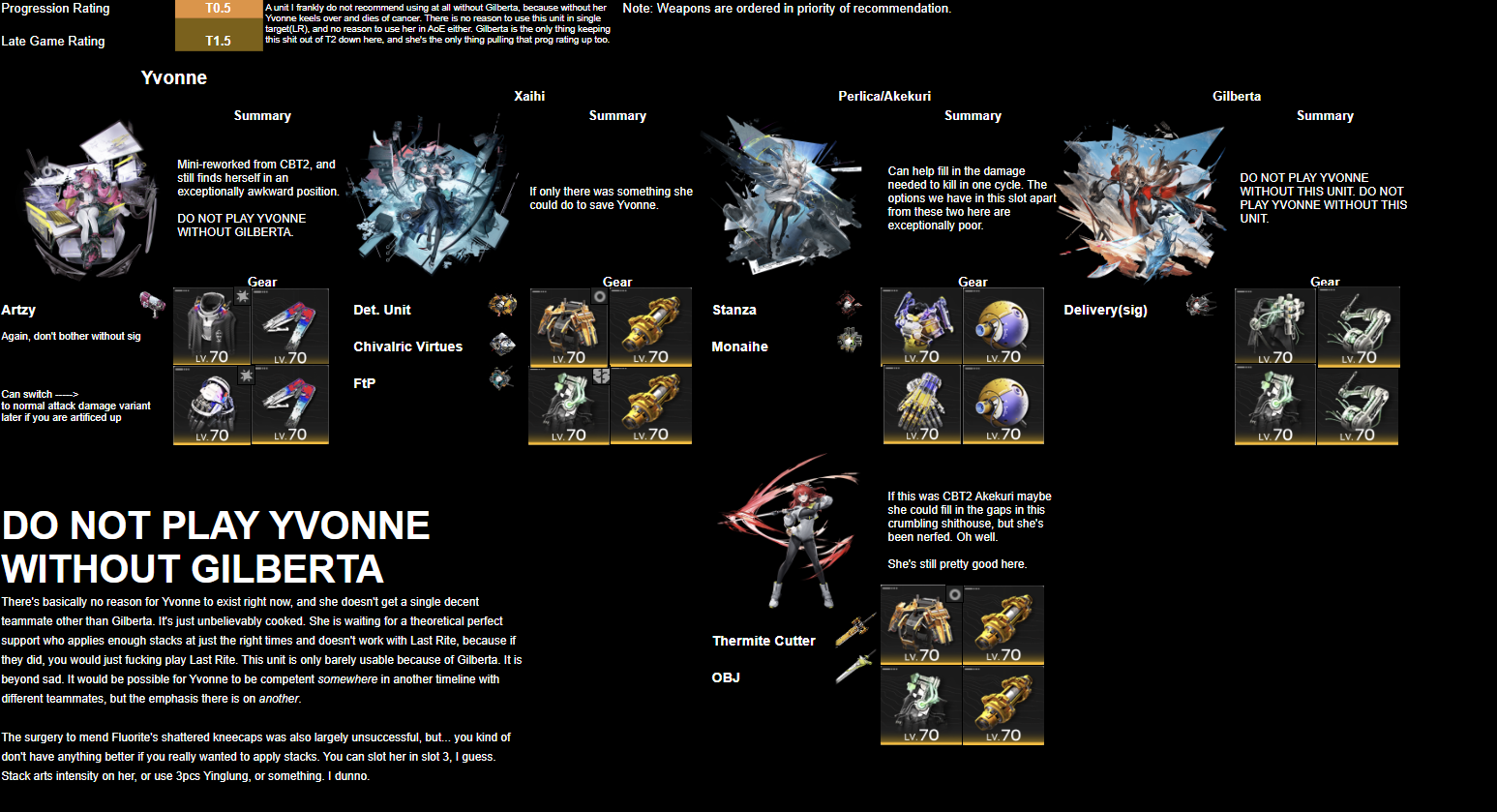 >A unit I frankly do not recommend using at all without Gilberta, because without her Yvonne keels over and dies of cancer. There is no reason to use this unit in single target(LR), and no reason to use her in AoE either. Gilberta is the only thing keeping this shit out of T2 down here, and she's the only thing pulling that prog rating up too.Yvonebros.....Our girl is a weak researcher not fit for combat.....