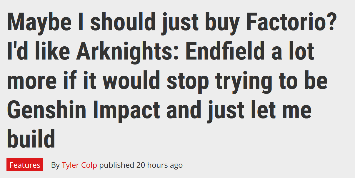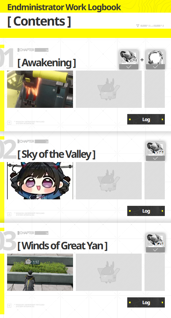 Previous thread: >>555476464>Official Websitehttps://endfield.gryphline.com/en-us>Official EN X (NEWS HERE)https://x.com/AKEndfield>Chartered Headhunting ScheduleJanuary 21st to February 7th --- "Scars of the Forge", (Laevatain)February 7th to February 24th --- "The Floaty Messenger", (Gilberta)February 24th to March 13th --- "Hues of Passion", (Yvonne)>Launch Reward Codes (Valid until January 29th)RETURNOFALLALLFIELDENDFIELDGIFTENDFIELD4PC>Twitch Dropshttps://endfield.gryphline.com/special/third-party-binding?channel=twitch>Voyage to the Stars (Ongoing until March 4th)https://endfield.gryphline.com/activity/voyage-to-the-stars/en-us/>Special Launch Streamhttps://www.youtube.com/watch?v=dz2g_D52NR0>Official Release Trailerhttps://www.youtube.com/watch?v=oJ00ggFb8A0>Official Release PV'shttps://www.youtube.com/watch?v=5Xm45NwWOlohttps://www.youtube.com/watch?v=UPpeeft1-8ohttps://www.youtube.com/watch?v=tN80M6IEMo0>Wikishttps://wiki.skport.com/endfield (Official)https://perlica.moehttps://warfarin.wiki/enhttps://endfield.wiki.gg/>Blueprint Guideshttps://talospioneers.com/en>Stickershttps://drive.google.com/drive/folders/13KH3L6QPIKkVH7pBddv4uxwmwJsnOtklhttps://drive.google.com/drive/folders/1OuVtjv1k-9c3M6n7d4PX3CGG5bkwH04ahttps://drive.google.com/drive/folders/1AStB8bzFk3lSwMwczWPkFYCBrZe0vHOghttps://drive.google.com/drive/folders/1yS0lqUhxf8tBRtpDFfCU1y16IS2sSeF7>Fr/end/sSubmit your info, /end/min:https://forms.gle/Fo7BhZMKaKqiWyL19View other /end/mins:https://docs.google.com/spreadsheets/d/1YtxiDss0hgEQhLlZgpfzyGrJrzUcqDzOS9T6IH-BiVc/edit?usp=sharing