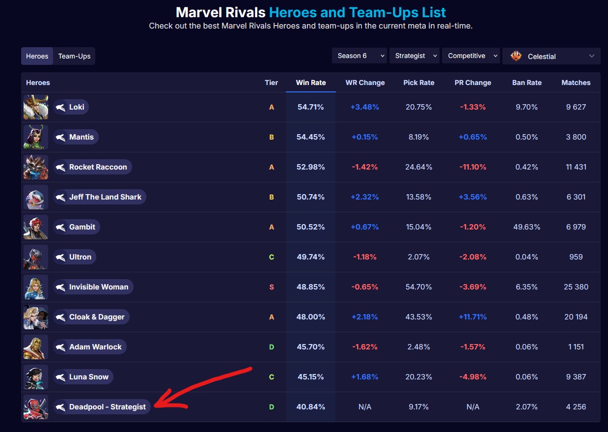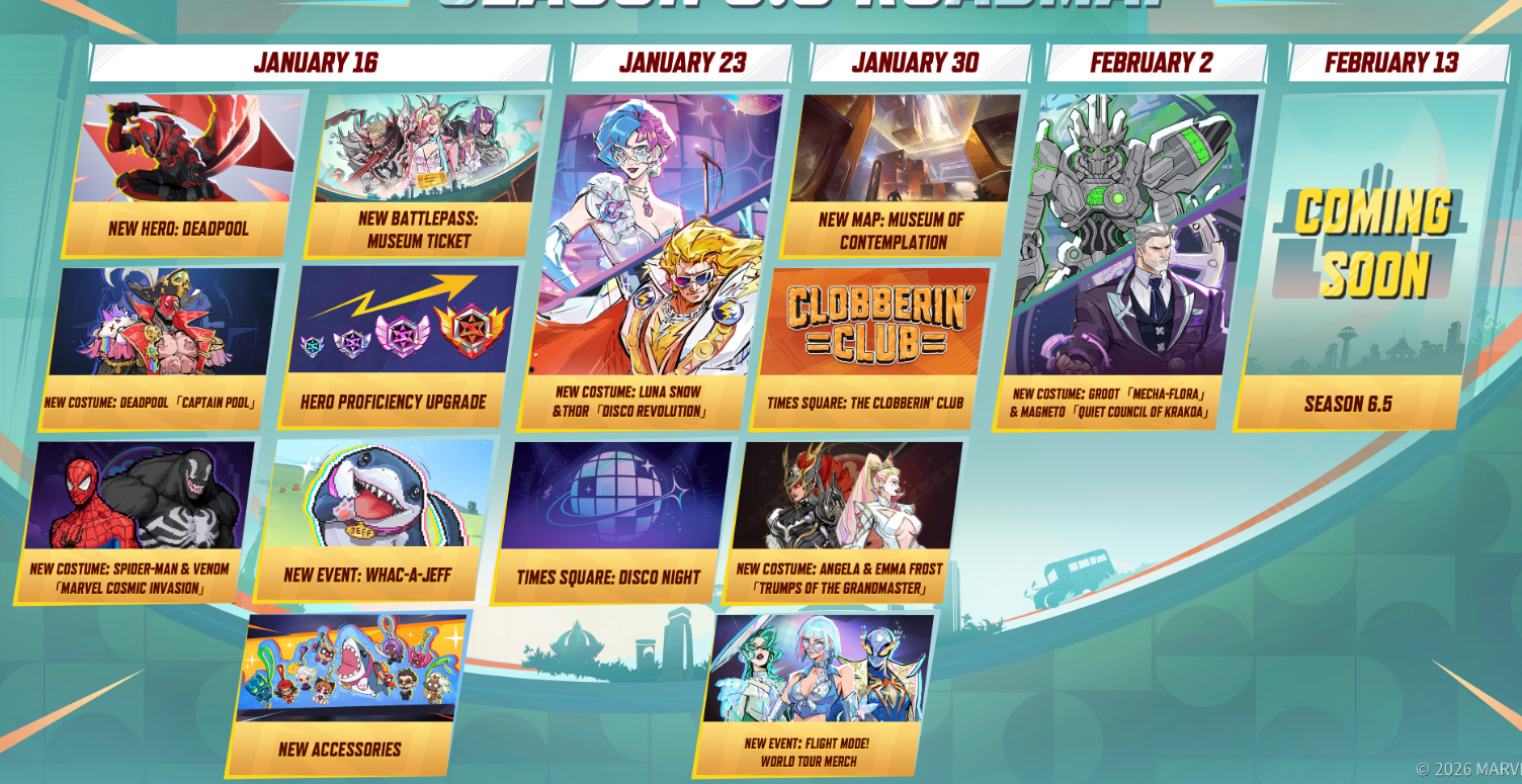 Queen of Diamonds Edition>NewsFlight Mode Event: https://x.com/i/status/2016541787058299059Deadpool Character Reveal: https://youtu.be/6Y1sQPyhz5sMap Reveal: Museum of Contemplation: https://youtu.be/AWEtIaKvs5wSeason 6 Battle Pass: Museum Ticket: https://youtu.be/EAQfj_68TEMDev Vision Vol. 13: https://youtu.be/rmU6RtypJ3wSeason 6.0 Roadmap: https://x.com/i/status/2011468543229907198Whac-a-Jeff Event: https://x.com/i/status/2011181460666126497Season 6: Night at the Museum Official Trailer: https://youtu.be/Aj53c2Uxrtc>StoreThor's Boogie Bolt and Luna Snow's Disco Pop skins: https://x.com/i/status/2013642855898624502Spider-Man and Venom's Marvel Cosmic Invasion skins: https://x.com/i/status/2011498553038798920https://x.com/i/status/2011483457617367362Deadpool's Captain Pool skin: https://x.com/i/status/2011151261224292453Adam Warlock's Cosmic Warlock and Phoenix's Ice Phoenix skins: https://x.com/i/status/2008569384034291792Human Torch's Jack of Hearts skin: https://x.com/i/status/2006394923981898142Loki's Lady Loki skin: https://x.com/i/status/2006032816249909267Thor's God of Winter and Cloak & Dagger's Ice Pas de Deux skins: https://x.com/i/status/2003495853785219166Angela's Ace of Spades and Emma Frost's Queen of Diamonds skins: https://x.com/i/status/2016179585172361629>LinksHero Hot List: https://marvelrivals.com/heroes_data/Guides & News: https://marvelrivals.gg/Tracker Resources: https://rivalstracker.comMobalytics Page: https://mobalytics.gg/marvel-rivalsFANDOM Wiki: https://marvelrivals.fandom.com/Checkpoint: >>555419276