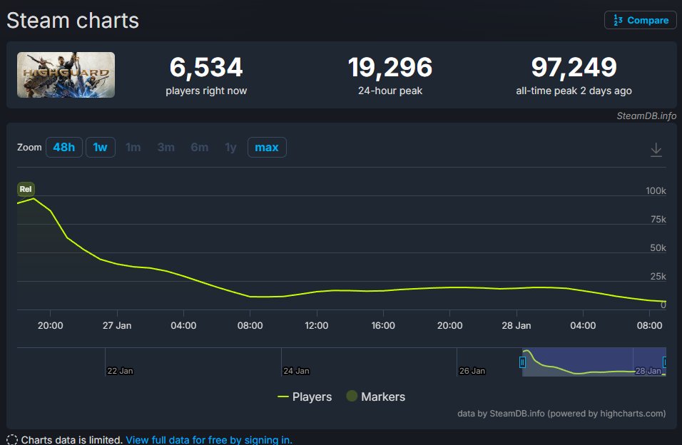 coming from FragPunk experience, I find it so fucking annoying how much hate towards X game people haslike, people seeing this numbers and their first thought - yeah, dead, ggwhen I streamed FragPunk on it's peak, there was 50k players daily and people STILL were coming to my chat and constantly yap about game dying50k players daily - dead20k players daily - dead10k players daily - deadwhile playercount can say a lot about games, THIS by any means does not mean the game is "dead", the biggest fuck up for Highguard launch was optimization, no matter how much I personally liked the game I COULDN'T PLAY IT, I legit locked my fps to 60 for playable experience lolnow, that people are using the FPS config and devs knows about optimization issues (and many other issues) they actually started to enjoy the game?! WOW?!? it's a matter of time until people gonna fully enjoy the game, while I totally agree they should've delayed the launch and polish the game more but the damage is already done, all we can do is to wait for quick updates & patch notes to fully enjoy the gameI just want more high-quality shooters on the market because no fucking way people are still onetricking val/cs/ow/rb-six/mr and not getting BORED? like, all these games were released so many years ago (except MR) that I find them so boring, as soon as FragPunk got released I instantly hopped on it and boom 1.5k hoursI wish Highguard can succeed and maintain a nieche in the long-term, they are clearly very passionate about the game, give them a second chance.