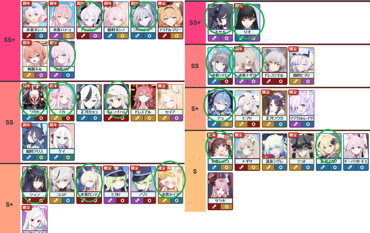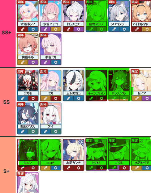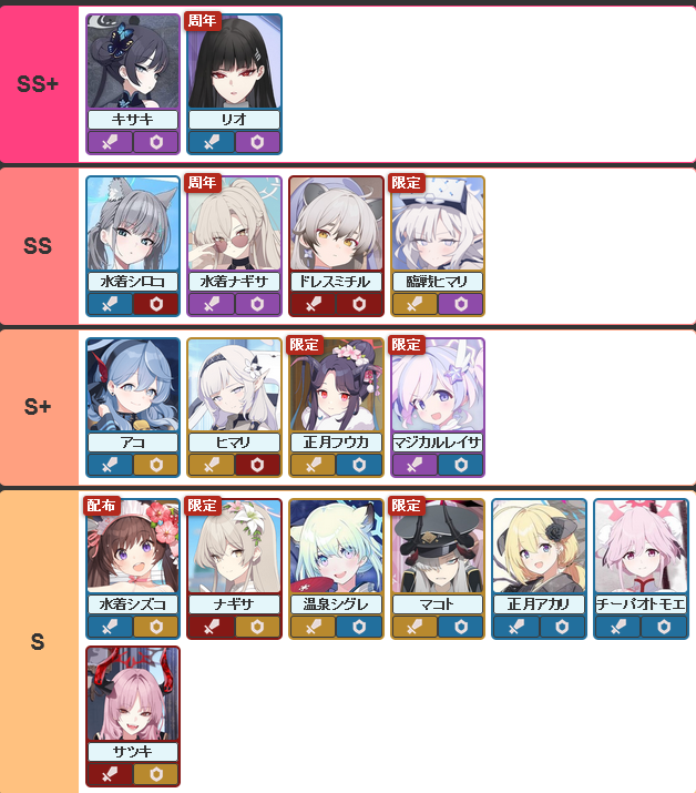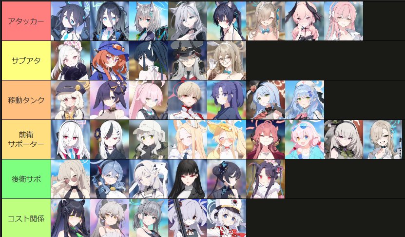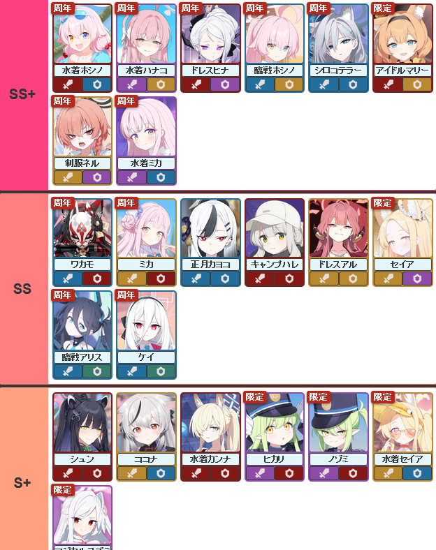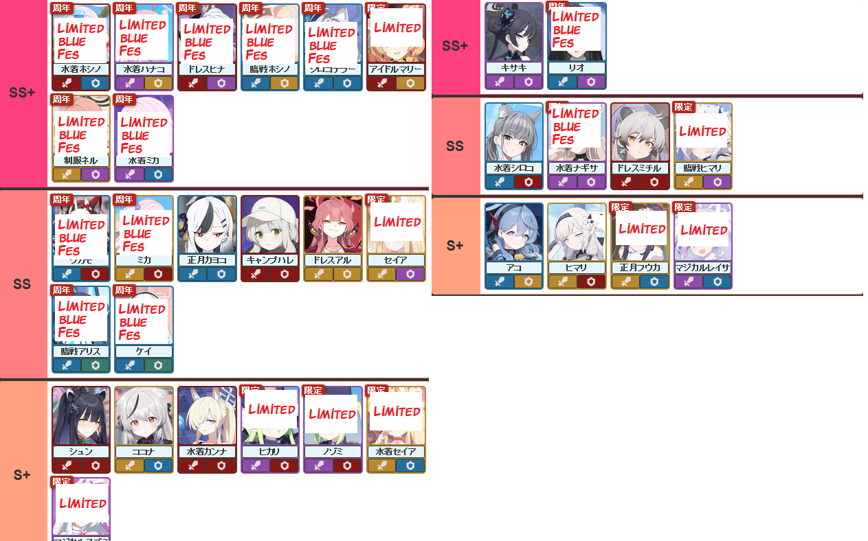 >>555536248Just a tier list for raid usage, and possibly general usage. Like all tier lists, it's not perfect for all situations and is subjective, but it's an okay list.From >>555532994 and >>555533154https://rentry.org/bagguideshttps://rentry.org/how2playbaTier list possibly from here https://kamigame.jp/bluearchive/page/142375924644479448.html