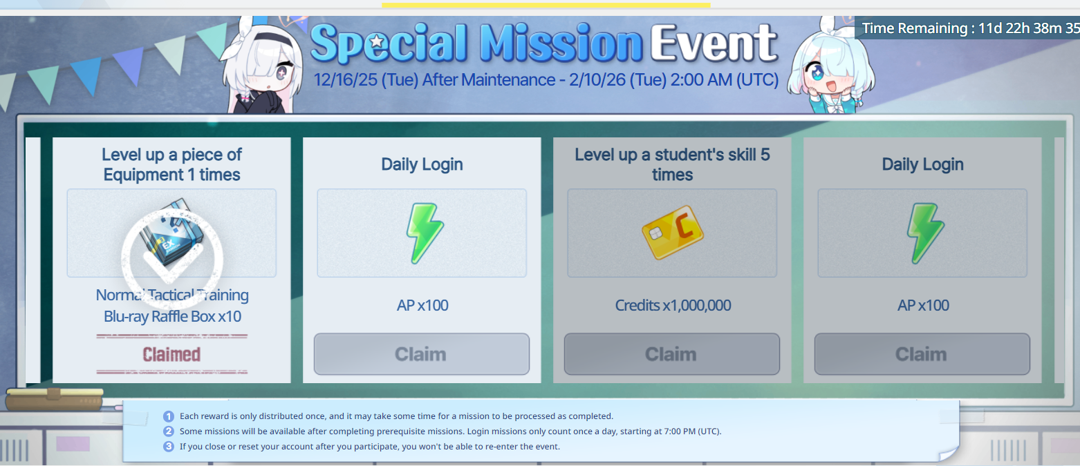 Previous Thread: >>555492220>Guides, Resources and useful links:https://rentry.org/bagguides>/bag/Circles/Clubs/Friends:https://rentry.org/holdingthebag>4koma, Manga, Side Content, PVs & Shortshttps://rentry.org/bacontent>>(JP) – JST>Banners:>1/29 After Maint – 2/5 10:59Aris (Battle – Limited)Kei (Limited)Hoshino (Battle – Limited)Shiroko*Terror (Limited)>News:Patch notes: https://bluearchive.jp/news/newsJump/624>Events:Steel Continent Assault: Malkuth Battle – 1/29 After Maint – 2/12 10:595th Anniversary Login Bonus – 1/20 After Maint – 2/12 10:59>Content:Joint Firing Drill (Defense) – 1/29 After Maint – 2/5 3:59Limit Break Assault: Chokmah (Field w/Special Armor) – 1/21 11:00 – 2/12 3:593x Bounty/Normal/Hard – 1/29 4:00 – 2/5 3:593x Commission/Lesson – 2/5 4:00 – 2/12 3:592x Account EXP – 2/7 4:00 – 2/9 3:59>>(GLOBAL) – UTC>Banners:>1/27 After Maint – 2/10 1:59Misaki (Swimsuit)Saori (Swimsuit – Limited)Hiyori (Swimsuit – Limited)Neru (Bunny – Limited)Karin (Bunny – Limited)Akane (Bunny)>News:Patch notes: https://forum.nexon.com/bluearchive-en/board_view?thread=3355429>Events:Sheside outside – 1/27 After Maint – 2/10 1:59The Arius District's Emergency Class Mission – 2/3 2:00 – 3/10 1:59My Office: https://bluearchive.nexon.com/user/myoffice>Content:Joint Firing Drill (Shooting) – 1/27 2:00 – 2/2 18:59Grand Assault: Chesed (Field – Torment w/Elastic Armor) – 2/3 2:00 – 2/9 18:59Limit Break Assault: Chokmah (Field – w/Special Armor) – 1/14 2:00 – 2/9 18:592x Lesson/Scrimmage – 1/26 19:00 – 2/2 18:592x Commissions/Hard – 2/2 19:00 – 2/9 18:59