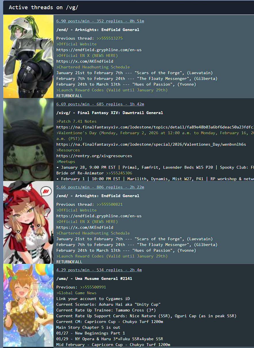 Previous thread: >>555513275>Official Websitehttps://endfield.gryphline.com/en-us>Official EN X (NEWS HERE)https://x.com/AKEndfield>Chartered Headhunting ScheduleJanuary 21st to February 7th --- "Scars of the Forge", (Laevatain)February 7th to February 24th --- "The Floaty Messenger", (Gilberta)February 24th to March 13th --- "Hues of Passion", (Yvonne)>Launch Reward Codes (Valid until January 29th)RETURNOFALLALLFIELDENDFIELDGIFTENDFIELD4PC>Twitch Dropshttps://endfield.gryphline.com/special/third-party-binding?channel=twitch>Voyage to the Stars (Ongoing until March 4th)https://endfield.gryphline.com/activity/voyage-to-the-stars/en-us/>Special Launch Streamhttps://www.youtube.com/watch?v=dz2g_D52NR0 [Embed]>Official Release Trailerhttps://www.youtube.com/watch?v=oJ00ggFb8A0 [Embed]>Official Release PV'shttps://www.youtube.com/watch?v=5Xm45NwWOlo [Embed]https://www.youtube.com/watch?v=UPpeeft1-8o [Embed]https://www.youtube.com/watch?v=tN80M6IEMo0 [Embed]>Wikishttps://wiki.skport.com/endfield (Official)https://perlica.moehttps://warfarin.wiki/enhttps://endfield.wiki.gg/>Blueprint Guideshttps://talospioneers.com/en>Stickershttps://drive.google.com/drive/folders/13KH3L6QPIKkVH7pBddv4uxwmwJsnOtklhttps://drive.google.com/drive/folders/1OuVtjv1k-9c3M6n7d4PX3CGG5bkwH04ahttps://drive.google.com/drive/folders/1AStB8bzFk3lSwMwczWPkFYCBrZe0vHOghttps://drive.google.com/drive/folders/1yS0lqUhxf8tBRtpDFfCU1y16IS2sSeF7>Fr/end/sSubmit your info, /end/min:https://forms.gle/Fo7BhZMKaKqiWyL19View other /end/mins:https://docs.google.com/spreadsheets/d/1YtxiDss0hgEQhLlZgpfzyGrJrzUcqDzOS9T6IH-BiVc/edit?usp=sharing