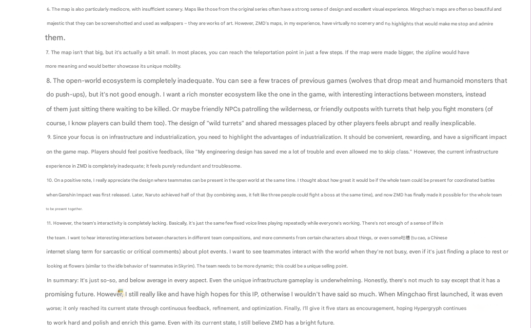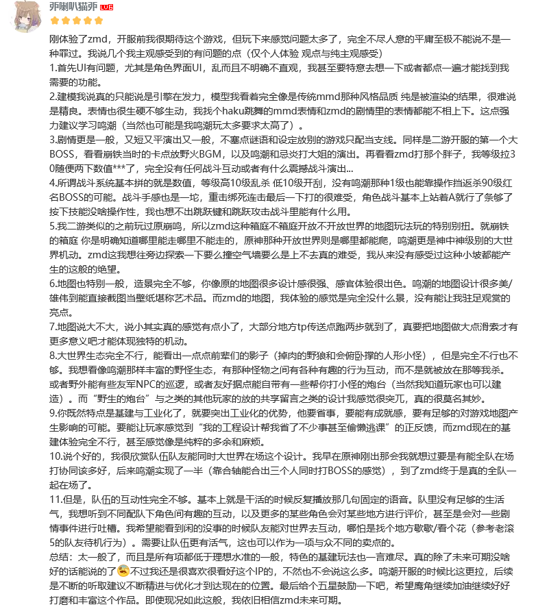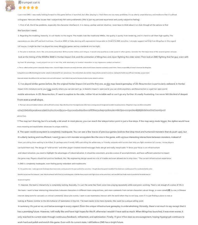 >>555540870It's getting a lot of negative reception on Bilibili. The most liked post on their page is a 3000+ characters long rant on the game being le bad because it's not like genshit LOL. I really hope they don't listen to these people and keep with their vision because clearly there's a market to it.