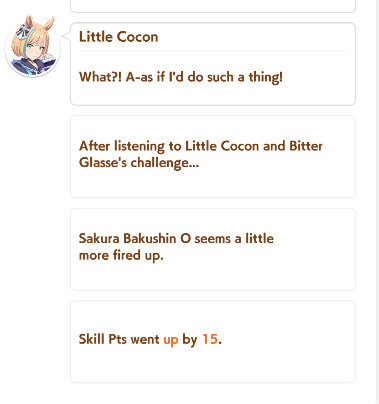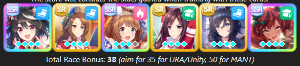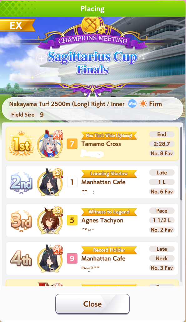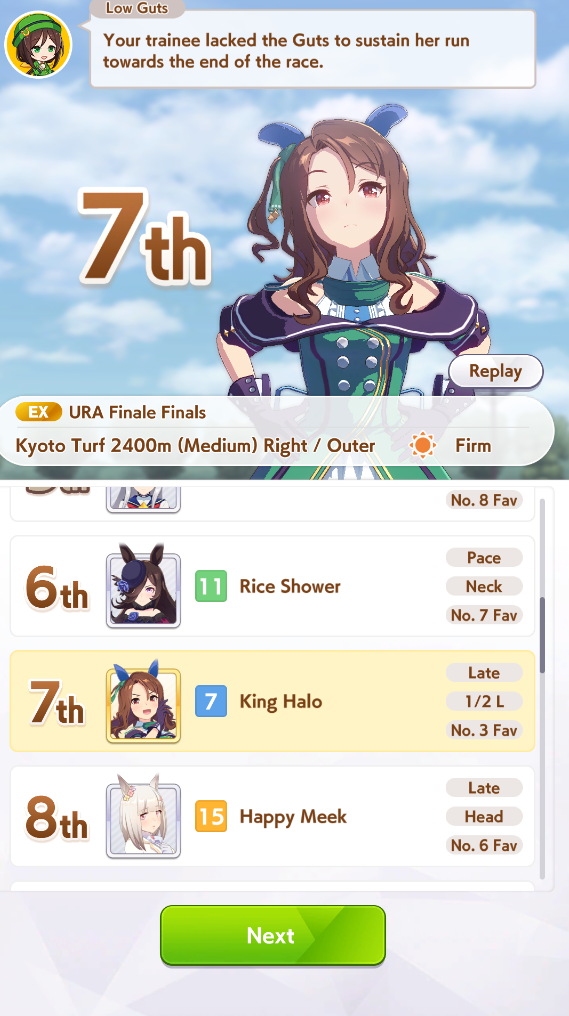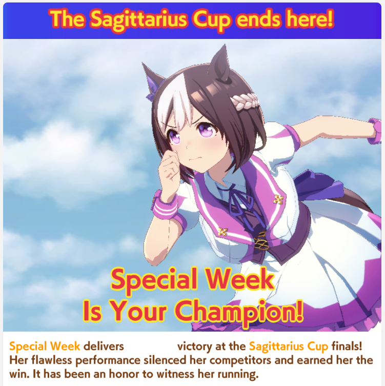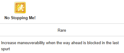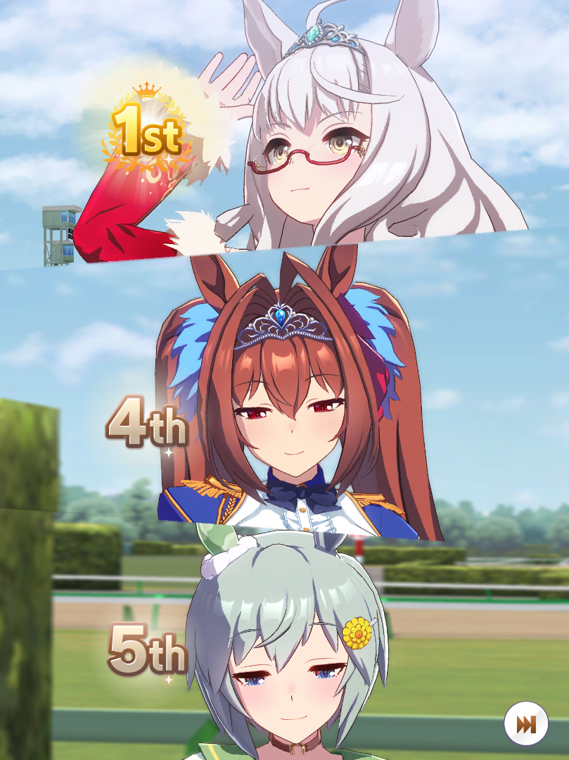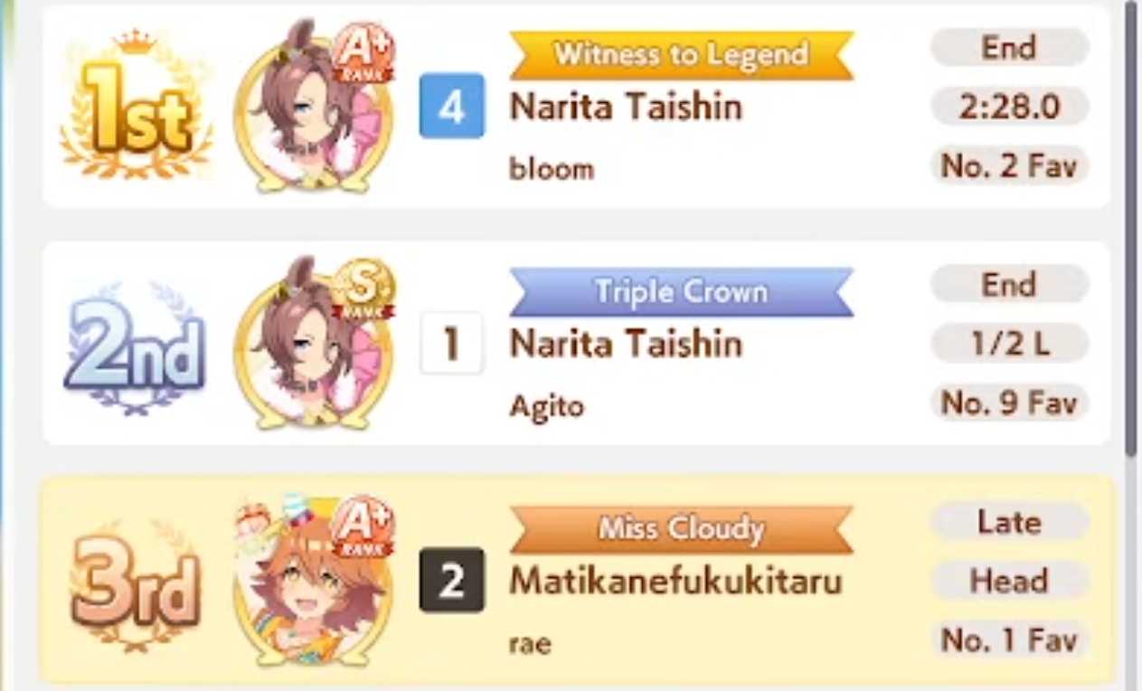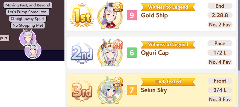 >>555551705I feel you. It's frustrating seeing your hardwork get beaten by a silly RNG or simply because your other opponent activated the skill at the perfect time, or your witlet of an enemy moves up while your witgod honse moves back simply because RNG willed it.I lost this time too so my future plan is just to get one maxed speed or distance S and be done with it. I don't want to sweat anymore with the game.