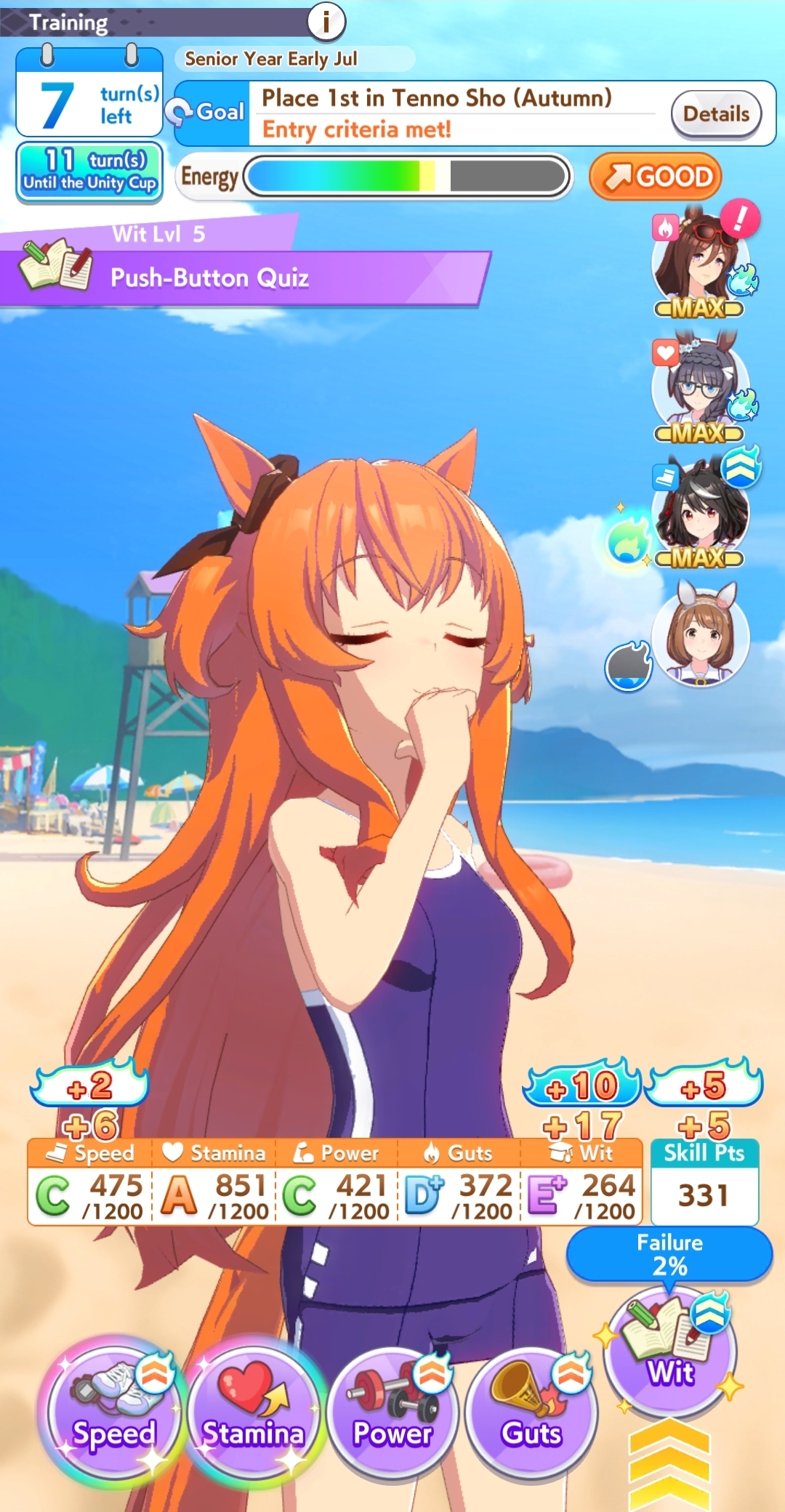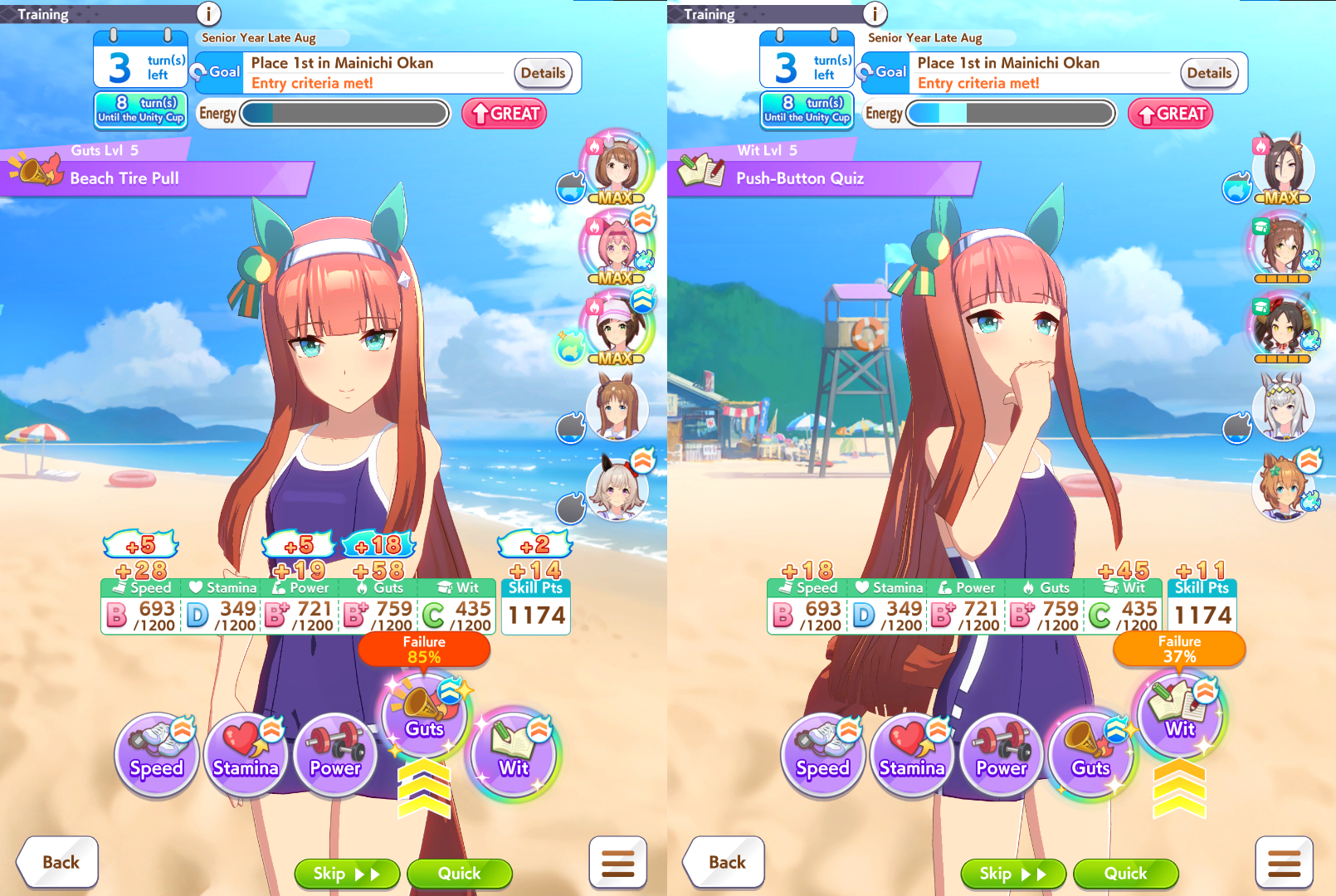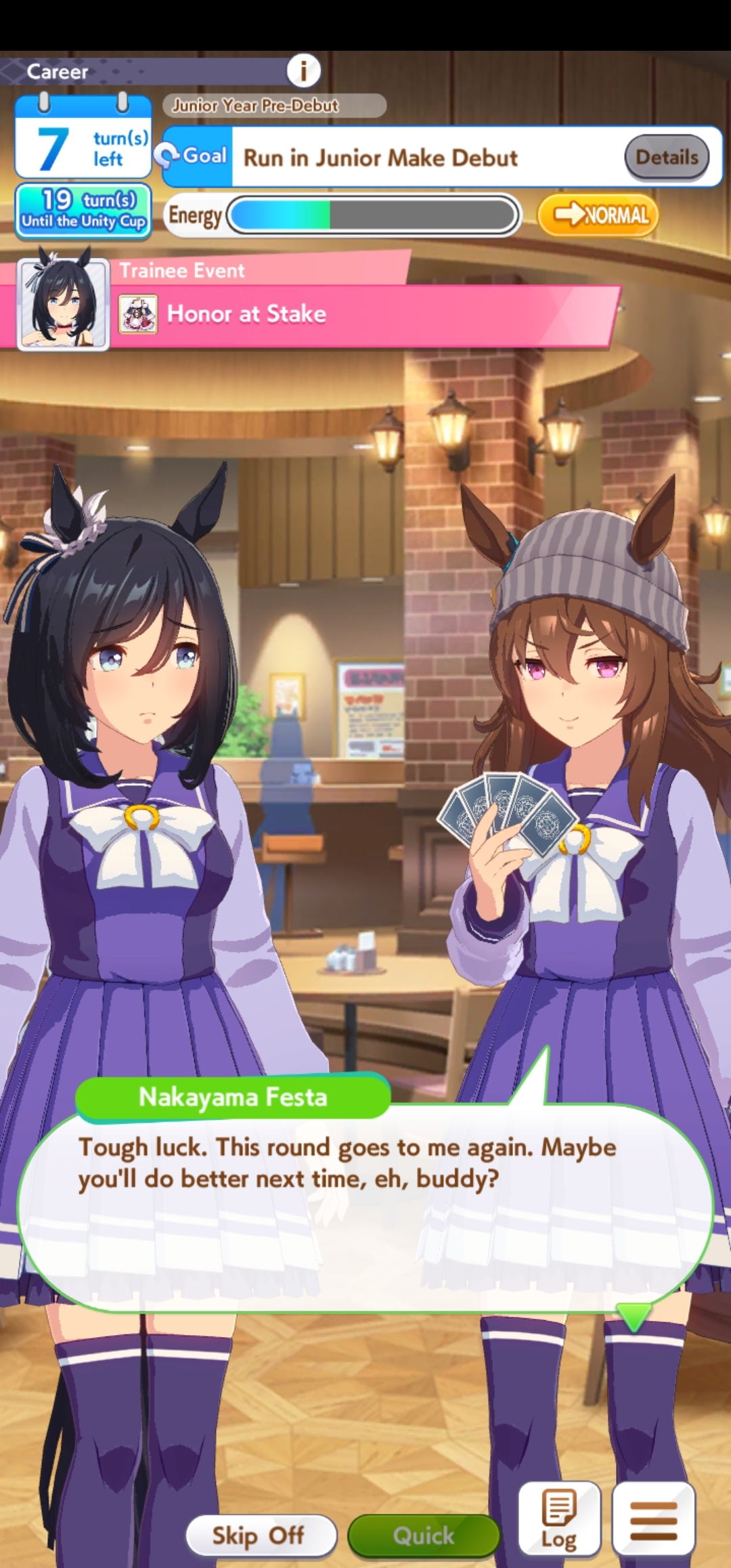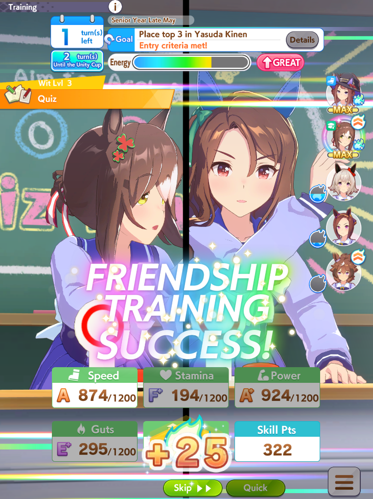 >>555551705I feel you. It's frustrating seeing your hardwork get beaten by a silly RNG or simply because your other opponent activated the skill at the perfect time, or your witlet of an enemy moves up while your witgod honse moves back simply because RNG willed it.I lost this time too so my future plan is just to get one maxed speed or distance S and be done with it. I don't want to sweat anymore with the game.