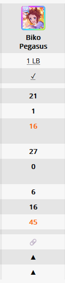 >>5555530254/8My win rates during the qualification races are usually in the 75%-90% range, but finals are always pretty random (lost by a nose, lost by a nose, got matched with a beastly 17k rating uma, etc)