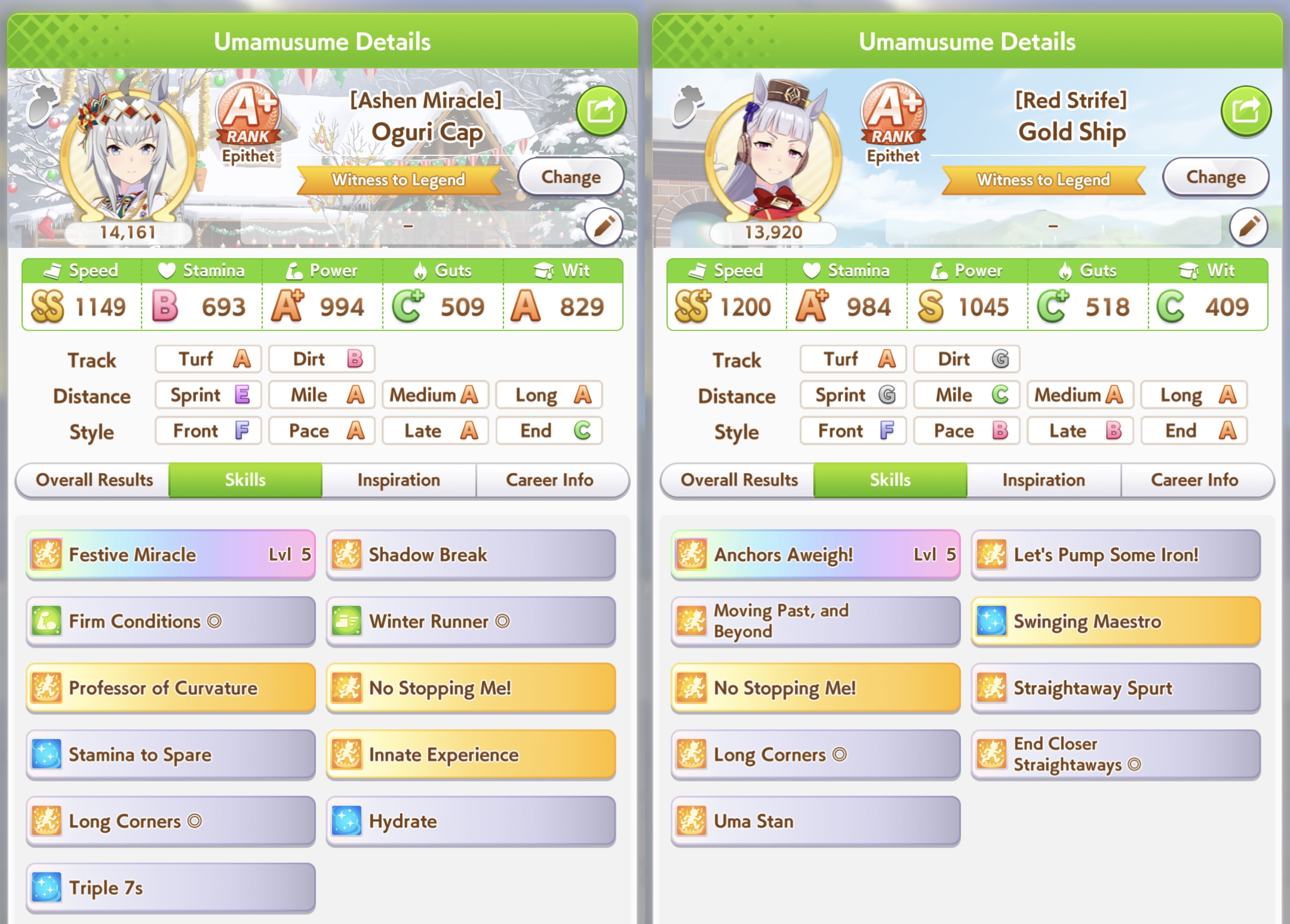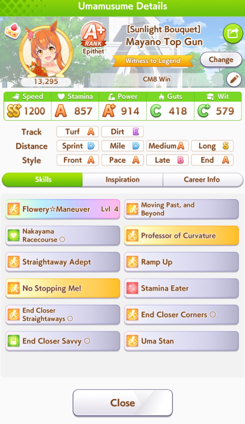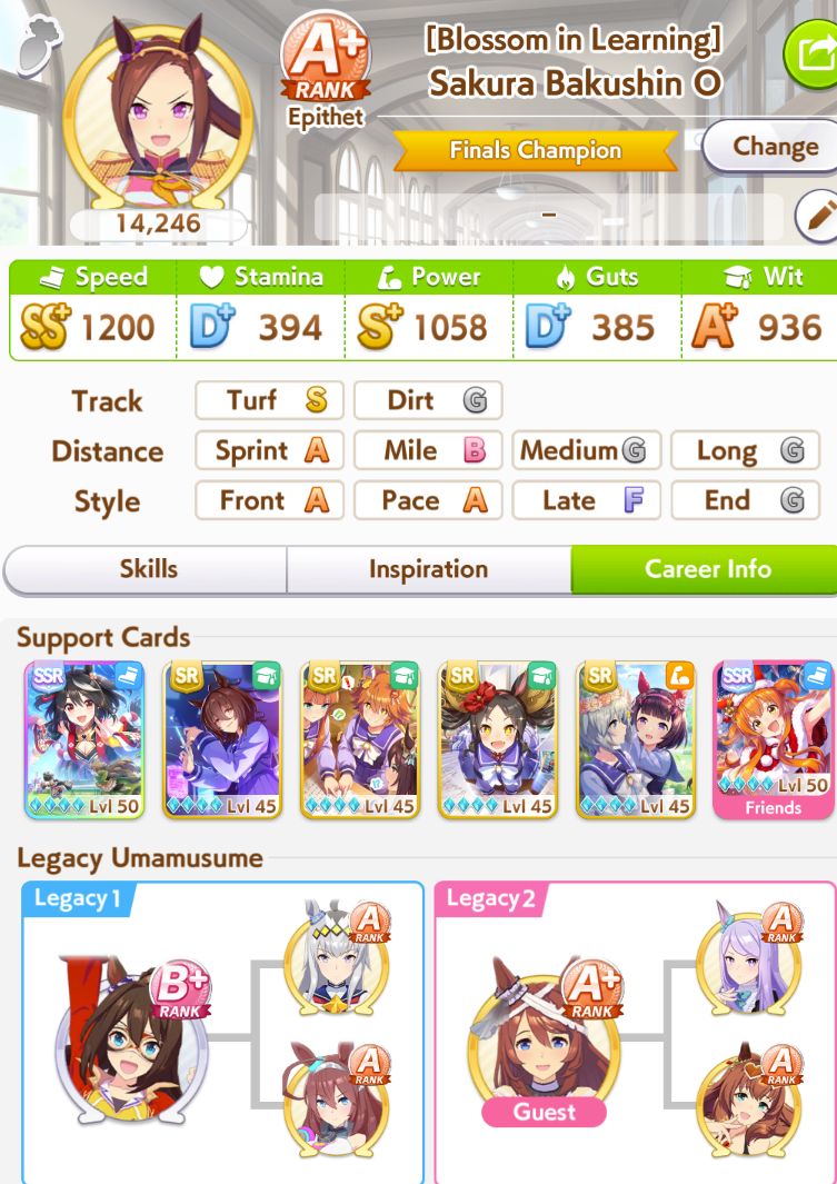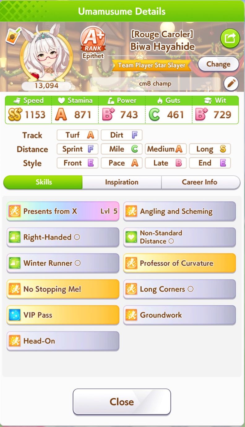 >>555554342They were all low wit (even mine) and one of the Taishins was gutsmaxing (846 sta and 1139 guts) and didn't have any heals and the other one whiffed Sleeping Lion but had 1k stamina and barely any mid-race skills>>555554267Christmas was definitely better this CM but OG does have a pretty good ult (mostly post-buff) and can be mutated to late/end and have it still work, though 10% guts 20% wit is a struggle I had to deal with 7 CMs in a row. OG Biwa might have some use in Pisces Cup thanks to having two innate gold recoveries (both get buffed with evolved skills too) but >>555554354 is sadly right, if she's not your oshi there's not too much of a reason to use her.