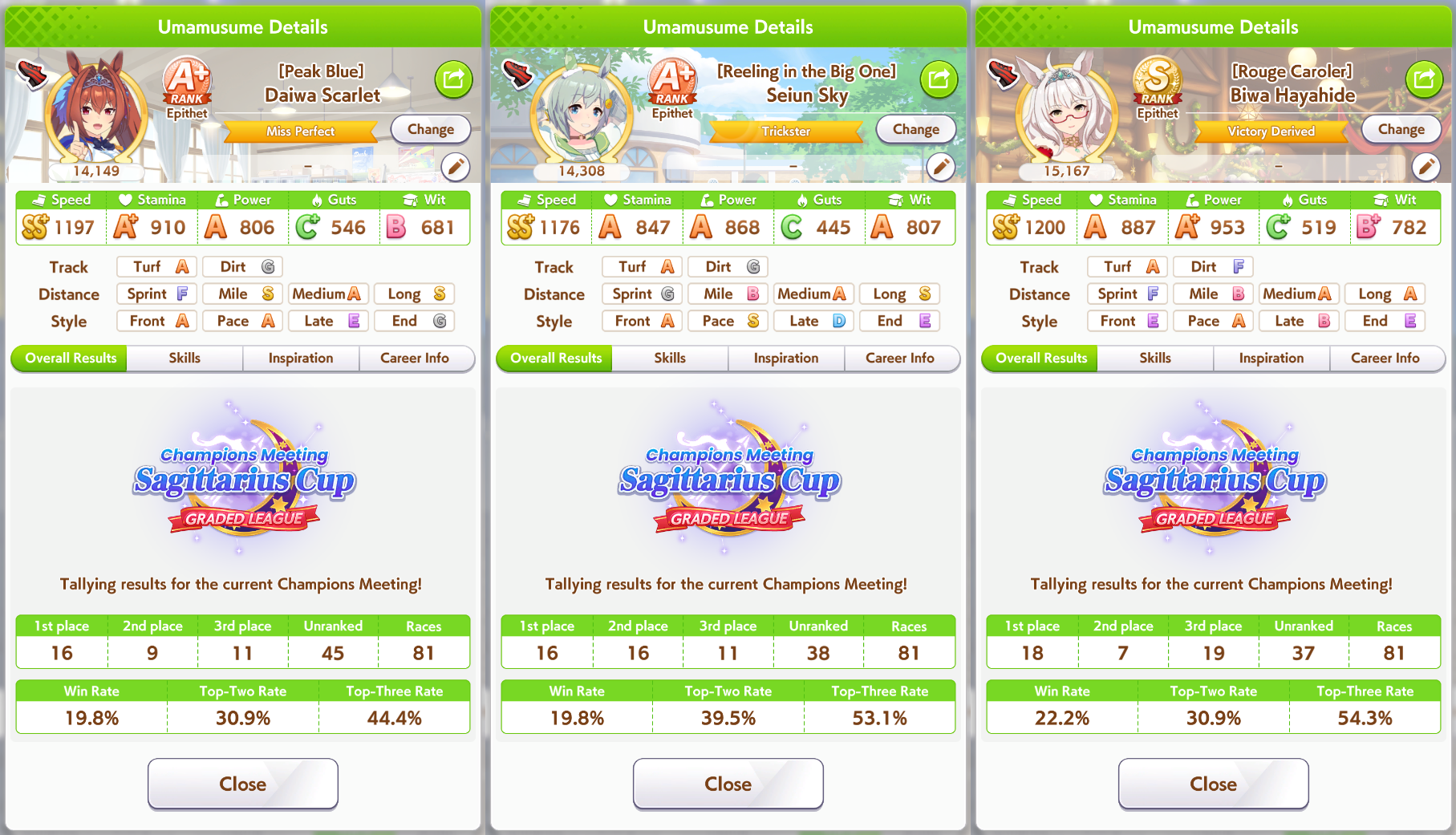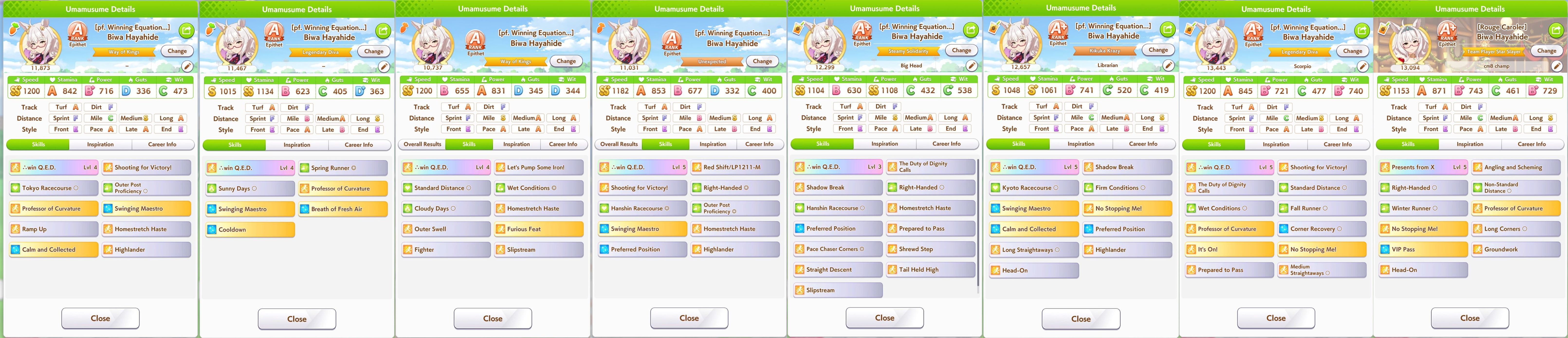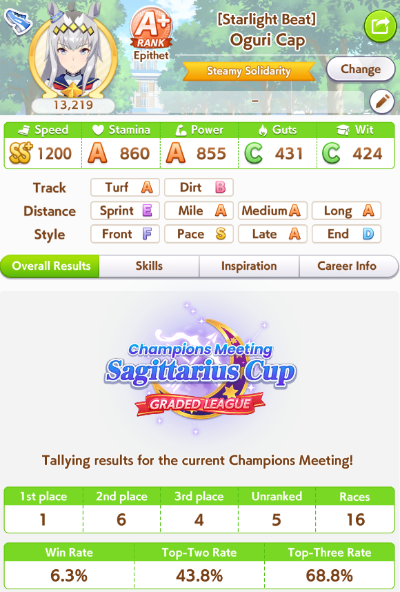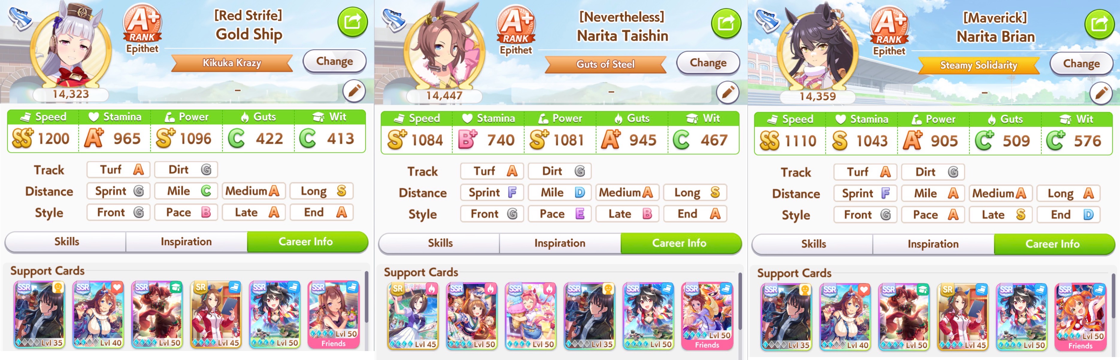 >>555554342They were all low wit (even mine) and one of the Taishins was gutsmaxing (846 sta and 1139 guts) and didn't have any heals and the other one whiffed Sleeping Lion but had 1k stamina and barely any mid-race skills>>555554267Christmas was definitely better this CM but OG does have a pretty good ult (mostly post-buff) and can be mutated to late/end and have it still work, though 10% guts 20% wit is a struggle I had to deal with 7 CMs in a row. OG Biwa might have some use in Pisces Cup thanks to having two innate gold recoveries (both get buffed with evolved skills too) but >>555554354 is sadly right, if she's not your oshi there's not too much of a reason to use her.