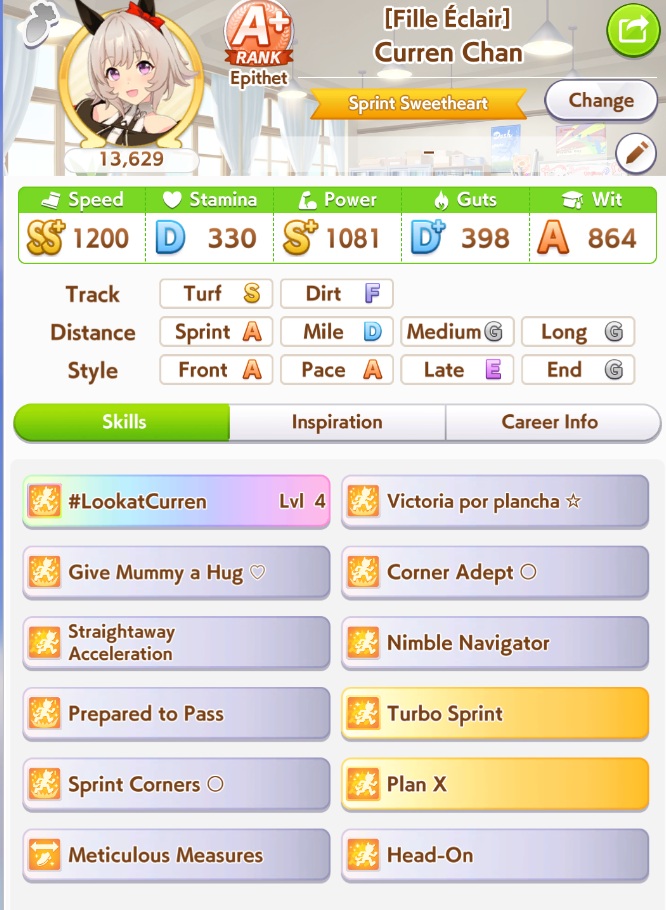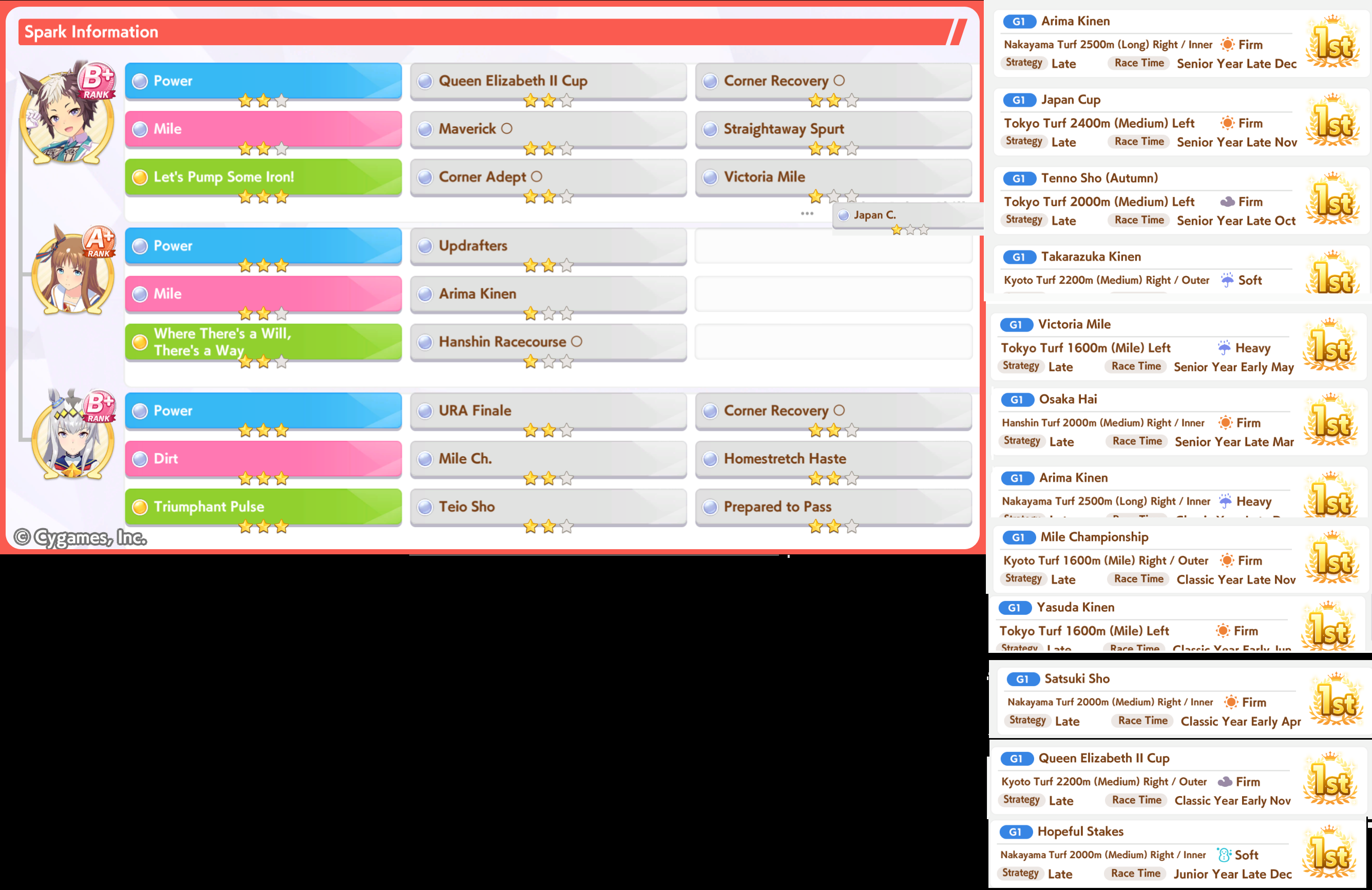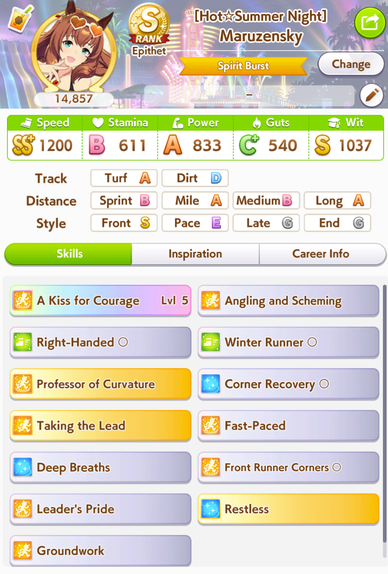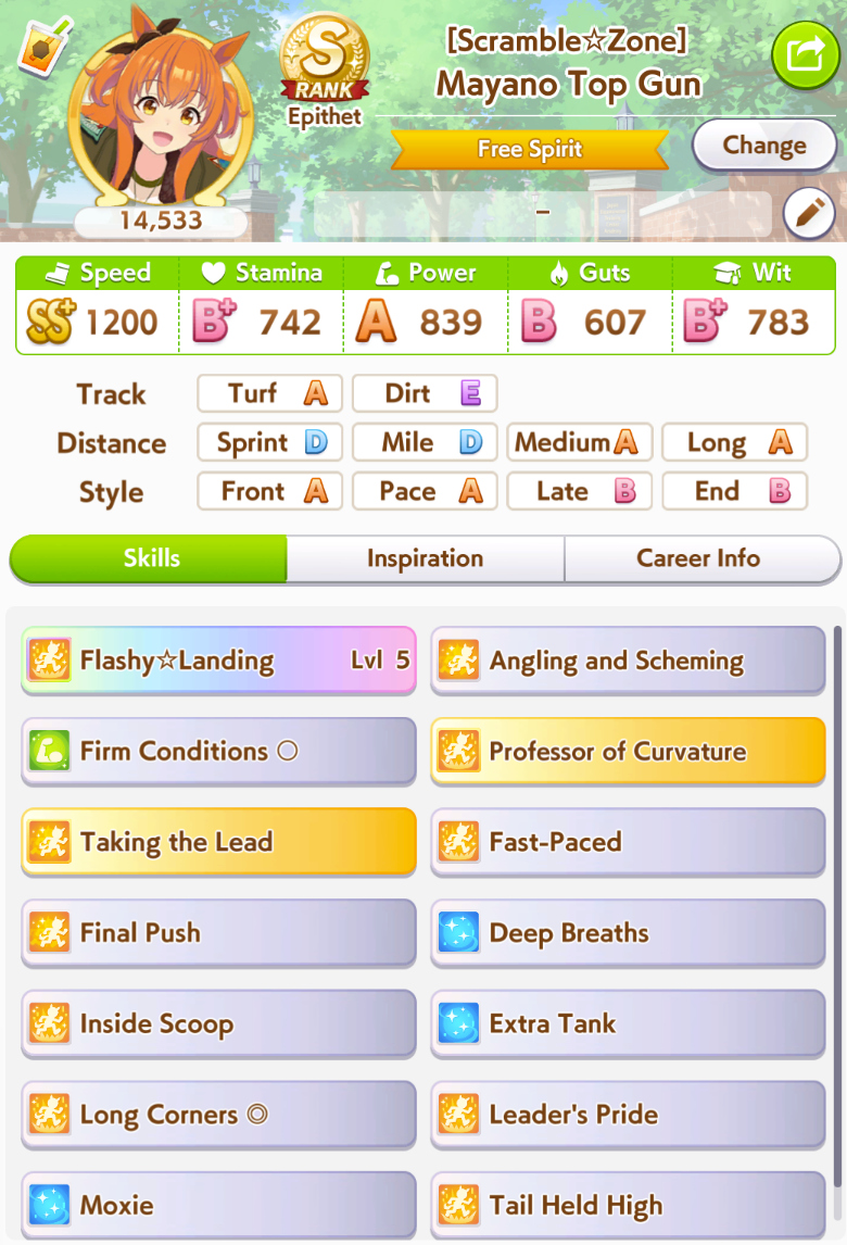 >>555552562Yeah that has all the stuff that I considered important for my own Hayahide. Congrats.I've been wondering if Concentration and Uma Stan would be just as good to keep her ahead of the other paces, but I haven't been able to test it for myself, whereas she has easy access to greens and I have some good groundwork parents of my own.