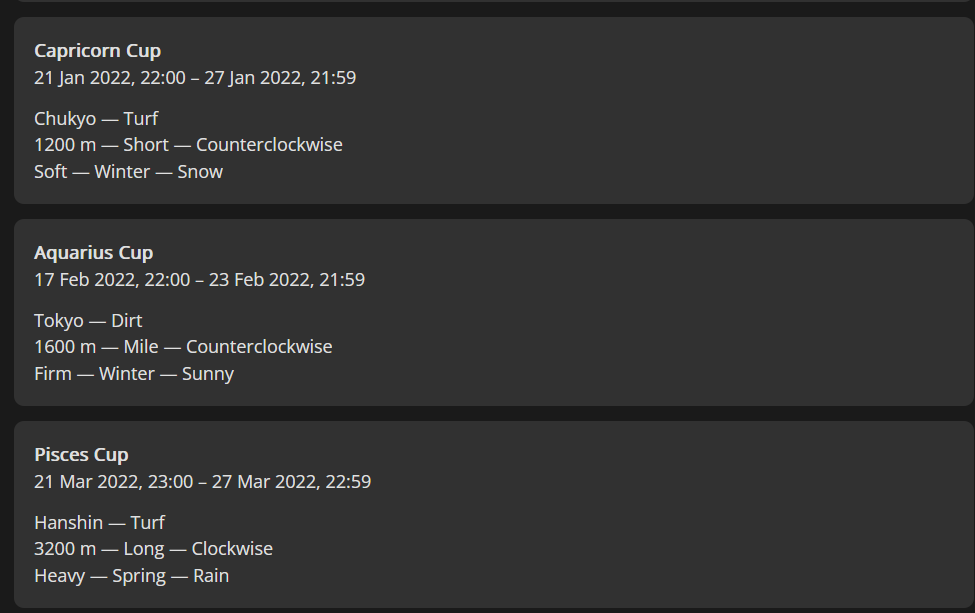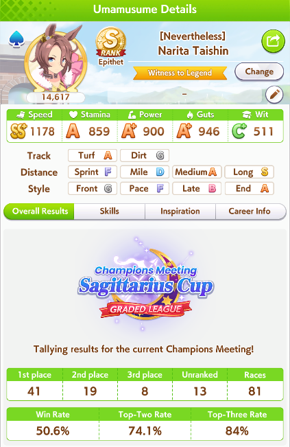 >>555551705RNG gonna RNG. >>555546149 I'm this bwo, Laisu won 4 races, all in Round 1, but pulled together for the Final. Unfortunately, every other CM final for me was either getting stat checked by better umas or people proccing the important skills while I didn't. I accepted it's a roulette, and I'm glad to have it land that one time for me, and pray Shiraoki-sama allows another one soon.On the plus side, you have some CMs coming up that's to your advantage. There is the 3200m wet track in three CMs, but otherwise, for like 6-7 months, everything else is sprints, dirts, miles, and mediums. It's a lot more in your favor for a while.