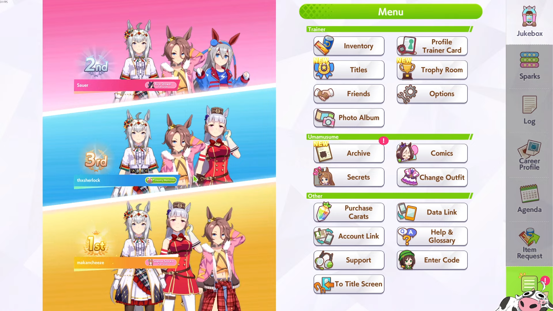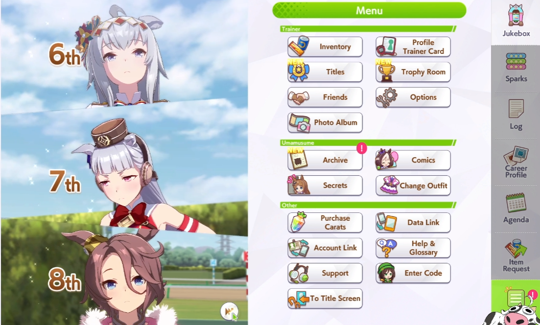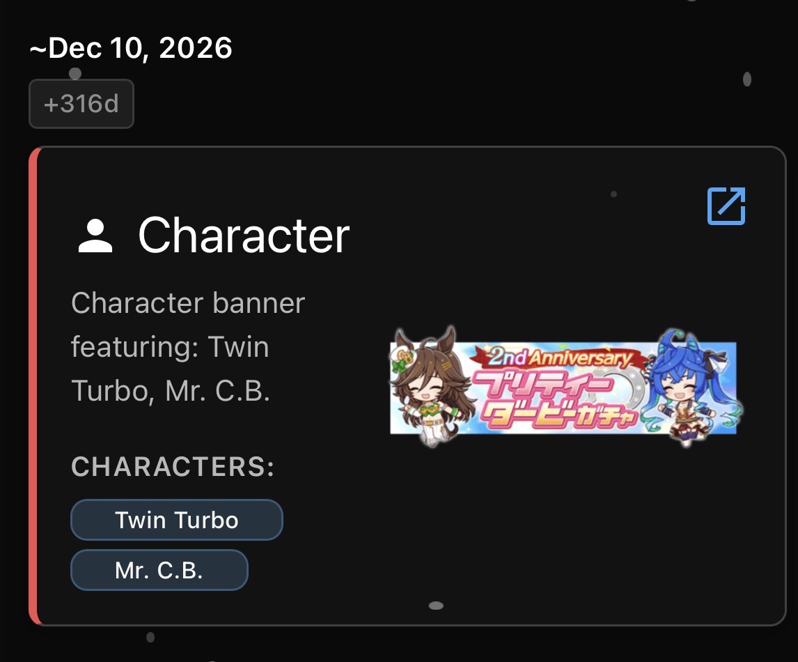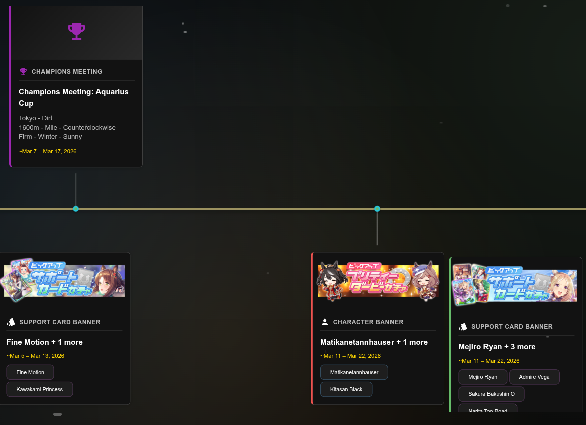 Previous: >>555515040>Global Game NewsLink your account to Cygames iDCurrent Scenario: Aoharu Hai aka "Unity Cup"Current Rate Up Trainee: Tamamo Cross (3*)Current Rate Up Support Cards: Nice Nature (SSR), Oguri Cap (as in peak SSR)Current CM: Capricorn Cup - Chukyo Turf 1200mMain Story Chapter 5 is out01/27 - New Beginnings Part 101/29 - NY Opera & Haru 3*+Fuku SSR+Ayabe SSRMid February - Capricorn Cup - Chukyo Turf 1200mhttps://umamusume.com/news/100040/https://pages.snep.pw/uma/anni-skill-changes/>JP Game NewsCurrent Rate Up: Kiseki (3*), Support Card Select Pick UpNew Scenario "Yukoma Hot Spring" releasedTimeline: https://uma.moe/timelineCygames Webstore: https://webstore.cygames.com/en/umamusume_en/>Thread Clubshttps://rentry.co/umaglobalclublistYou must be E3 (20k points) to join a circle. Apply with /uma/ or /vg/ in your profile or post ID in the thread.>All Guides & Resourceshttps://rentry.org/uma26Game databasehttps://gametora.com/umamusume (Click the gear to switch between JP / global server info)A basic guide for newfagshttps://rentry.org/umaglobalFind networks if your region is blocked from the game or clienthttps://www.umavpn.top/93Seiyuu & Concertshttps://rentry.org/umstUma Texthttps://umareader.idsmile.xyz/
