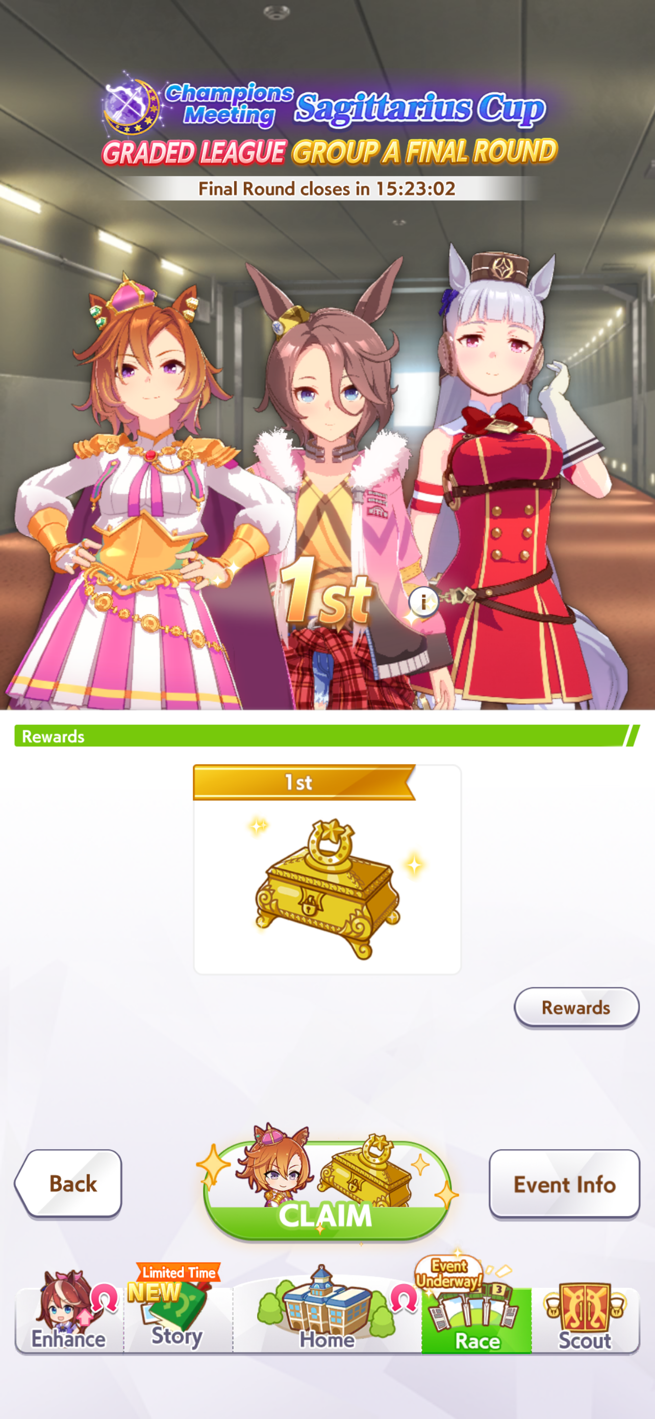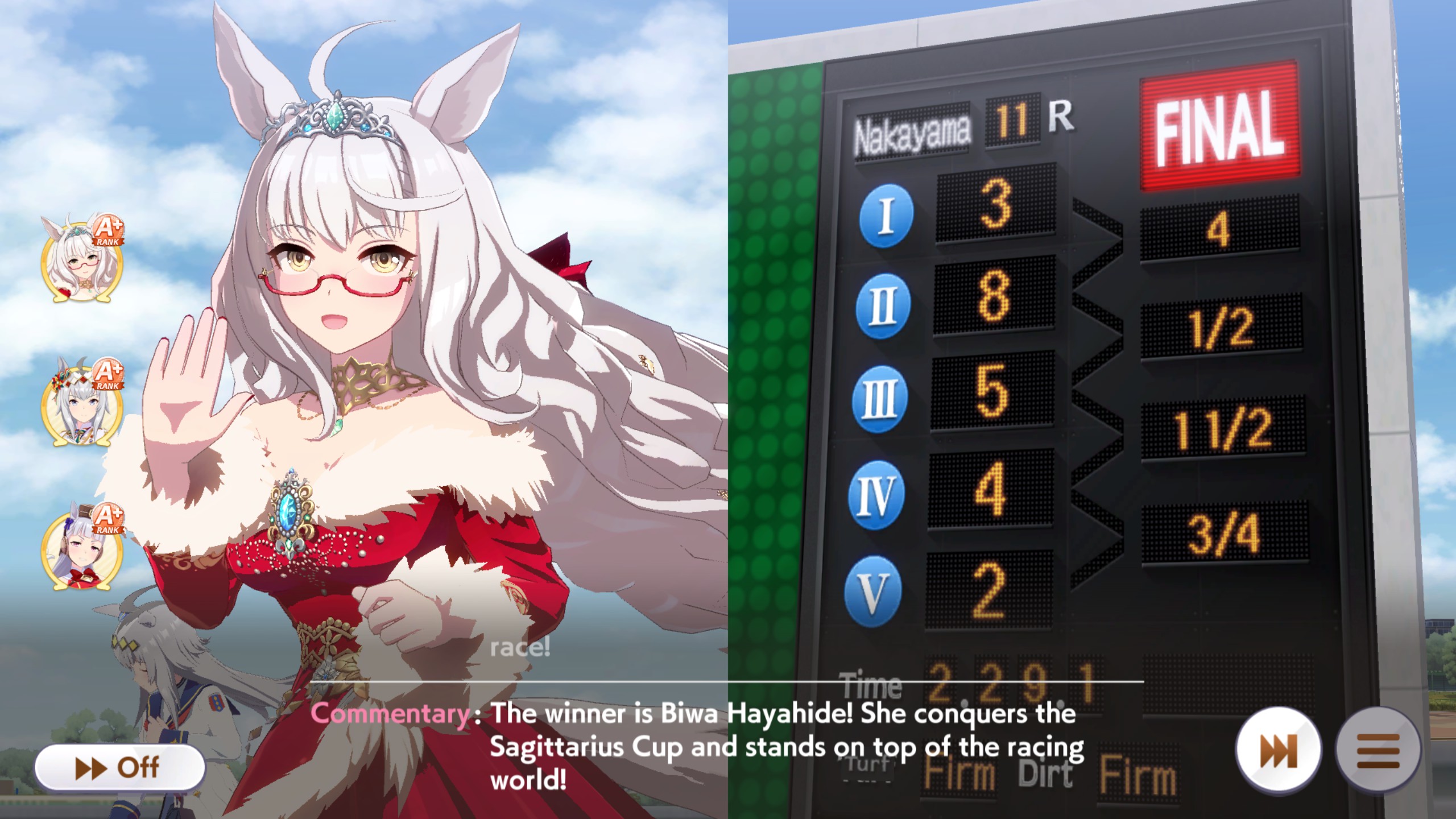 Oshi/Front gaming wonAfter jobbing every finals so far despite 60-80% WR in rounds every time, finally got my first plat.This time nothing went wrong and everything went right.Scarlet used Red Ace just in time to stay ahead of Hayahide and set up NSM for her.Three debuffers in my lobby. I was nervous when Cafe hit an (Dober's?) accel and started gaining, but Hayahide closed it out.https://litter.catbox.moe/g2e2g4zr2powky26.webm