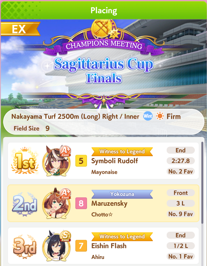 >>5555530254/8 to. Besides Taurus where I had no idea what I was doing, I've lost all the longs but won everything else.Was pretty close this time but got unlucky with straightaway spurt not firing on two uma's that probably would've won with it