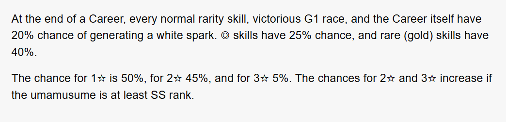 >>555554552When you make an uma with 12 aptitude sparks on the parents, they generate a white spark that acts like a pink spark when triggered. On top of the extra affinity JP parents have due to the post second anni G1 system, the base chance is also way higher if you bother to farm parents with these aptitude sparks.