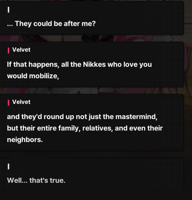 I don't like harem stuff and I wish the devs would add a special mode where the commander says no to every Nikke making sexual advances aside from the one I choose for him to marry.