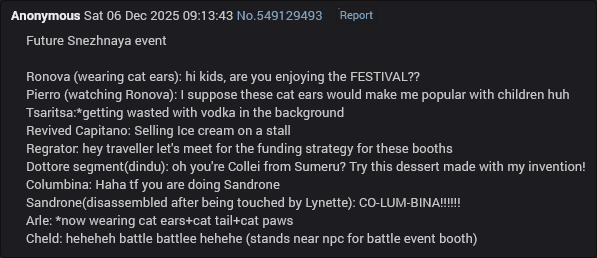 Previous: >>555533253 >Character Trailer - "Columbina: To Where She Flies"https://youtu.be/WsYsNoNjbaw (EN)https://youtu.be/9AVYsSZ1huA (JP) >Character Teaser - "Columbina: Where She Dwells"https://youtu.be/ME4OGvcPBUs (EN)https://youtu.be/7zLvIrPBGF4 (JP) >Version "Luna IV" "A Traveler on a Winter's Night" Trailerhttps://youtu.be/_yuHIzPJGHA (EN)https://youtu.be/wTL5hRtmWjM (JP) >Outfit Teaser: Teyvat Style – Nocturne of Serenityhttps://youtu.be/Q5I3xKJfIO4 (EN)https://youtu.be/TGsTYPeOtxw (JP) >Current character banner: Columbina, Ineffa, Ifa, Sethos, Fischl>Current weapon banner: Nocturne's Curtain Call (Catalyst), Fractured Halo (Polearm)https://www.hoyolab.com/article/43195155 >Daily check-in rewards (permanent)https://webstatic-sea.mihoyo.com/ys/event/signin-sea/index.html?act_id=e202102251931481&lang=en-us >Redeemable Codes with Primogems (all regions): https://genshin.mihoyo.com/en/giftGENSHINGIFT8X73KH58KDHNMoonInvitationLunaIV (NEW)P3GXX56W3VG9 >Useful Links (Wiki, Simulators, Maps, Character Builds, /gig/ friendlist, Third-Party Tools, etc.)https://rentry.org/giglinks /gig/ OP pastebin (use this if making new thread):https://pastebin.com/ca0zseQ9