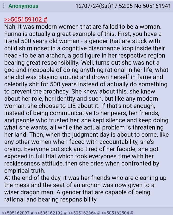 >>555575787Yeah, I understand you completely and agree. But if they did that then Wrio wouldn't sell (look at how badly Itto sold) because women don't like comic relief bums. And it would simulatenously make Neuv look like a horrible leader from the very start because what competent leader and Iudex allows a legitimate bum to rule a prison and even gives him a duke title? They could not have that. I feel like a lot of characterization of Wrio and Neuv from 4.0-4.2 period were just for show to sell them to more people and are now erased or forgotten. Because they value fujobait more than character personality. They can't let wrio be even semi-competent now (he wasn't exactly competent before but he was at least not overtly lazy) because then he wouldn't contrast Neuv at all and there would be not dynamic at all. Frankly, there is barely any even now but they are trying so fucking hard that it shows.