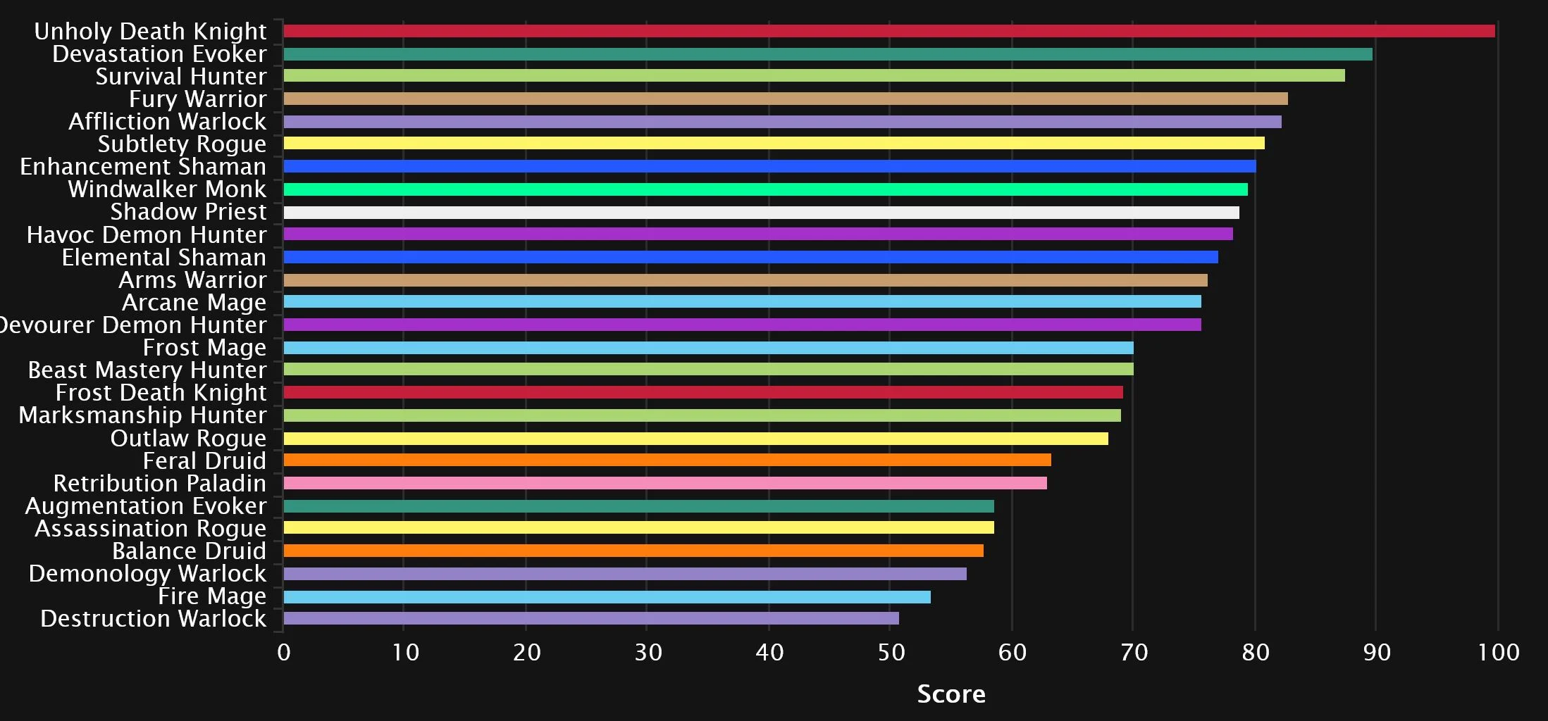 >>555564318>We have a huge number adjusting patch coming up before launch. None of this means anything right now.I was called literally a retard and literally the dumbest person ever for saying the exact same thing when people were speculating on the performance of individual talents. With that being said, unholy DK got a major rework of abilities as did shadow priest. I wouldn't be surprised if they both were top performers as that often happens.When people are speculating on the future performance of a spec they get too caught up in the math of the individual talents and not the fundamental behavior of the class. Specifically with shadow priest its significantly easier to mass dot a group of mobs vs previously when the only way possible was through a mid range cooldown.