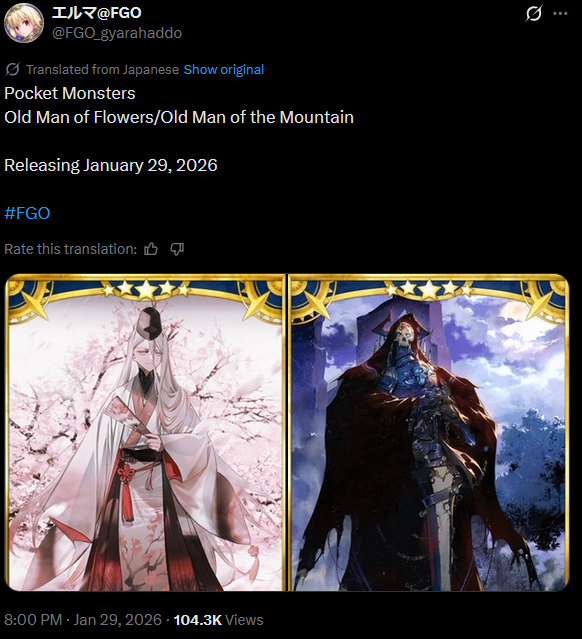 Previous: >>555403548>Chaldean Floralia, when your flowers bloom:●Event period: January 23 ~ February 13 JST (3 weeks).▶Requirement:-Main Quests: "The Beginning of Aftertime".-Free Quests: Fuyuki.▶Login Bonus: 3 Golden apples and 18 Silver apples.▶Welfare: 4*Alter Ego Flora.▶Ladder type event: collect "Flower Points" to advance the story. Main quest will be unlocked daily.▶Flower Garden Creation Quests: you can choose what flowers to plant in your garden.-The Flower Garden Skill would change depending on the quest you choose.▶Strengthening quest for Zhang Jue (NP).▶Event Bonus Servants:-20% more Bond Points after clearing any quest.-Chances of getting a great/super success when strengthening will be double.-AP consumption for Interludes/Strengthening Quests will be halved.▶Normal Chaldea Uniform:-Can be obtained by clearing the prologue.-Will be released on February 13th for all players who completed "The Beginning of Aftertime".▶Stormpods quests they will have their AP consumption halved.https://news.fate-go.jp/2026/01/chaldean_floralia/>Chaldean Floralia Hanasaka no Okina PU summon:●January 23 ~ February 13 JST.5*Caster Hanasaka no Okina (limited)4*Assassin Hebi Nyōbo (permanent)3*Caster Zhang Jue (permanent)https://news.fate-go.jp/2026/01/chaldean_floralia_pu/>Chaldean Floralia Ereskigal PU summon:●January 25 ~ February 13 JST.5*Lancer Ereshkigal (limited)3*Archer Robin Hood (permanent)https://news.fate-go.jp/2026/01/chaldean_floralia_pu2/>Chaldean Floralia Katsushika Hokusai PU summon:●January 27 ~ February 13 JST.5*Foreigner Katsushika Hokusai (limited)4*Saber Nero Claudius (story locked)https://news.fate-go.jp/2026/01/chaldean_floralia_pu3/>/fgog/ Friendlist form and spreadsheet (2026):https://forms.gle/WK4dwSC6Mn2WQfZu8https://docs.google.com/spreadsheets/d/1leQ09m5klFajbCcededkANJfeMiAmVz-PbCI_r7xyXc/edit?usp=sharing>Utility links:https://pastebin.com/iaWmXAq7