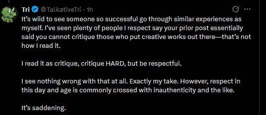 I don’t like people shitting on things others have created. Putting something out into the world makes you vulnerable, and that alone deserves respect, even if you dislike the creation. It’s easy to destroy things, it’s a lot harder to build them. The best critics understand this. Even when they’re being critical, they do their best not to be hurtful.