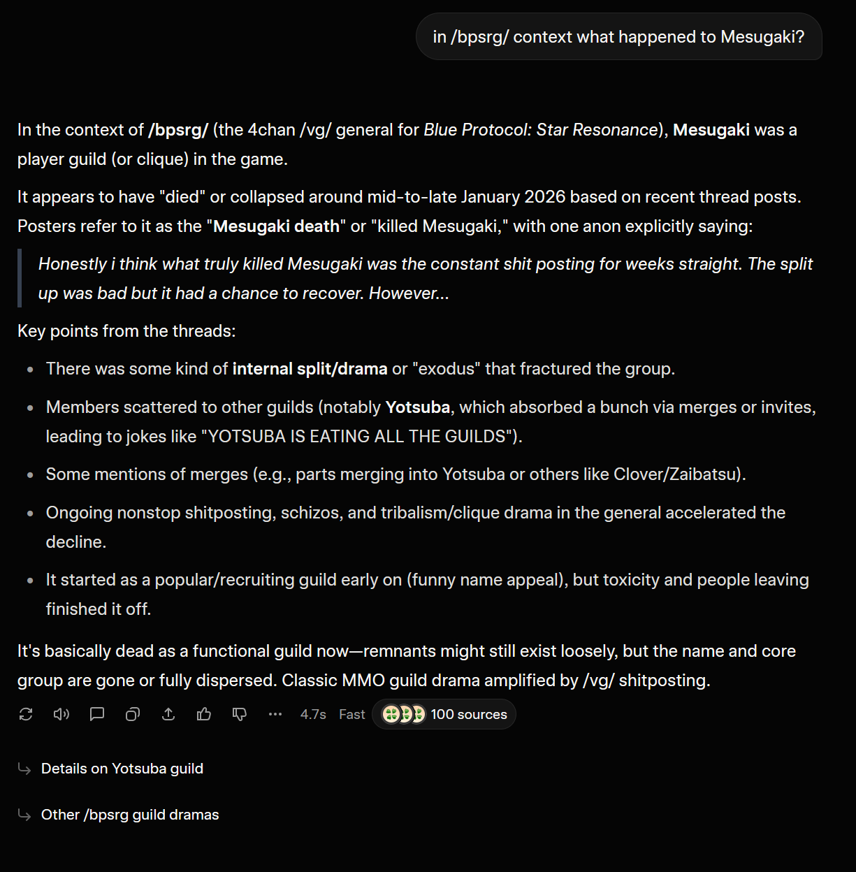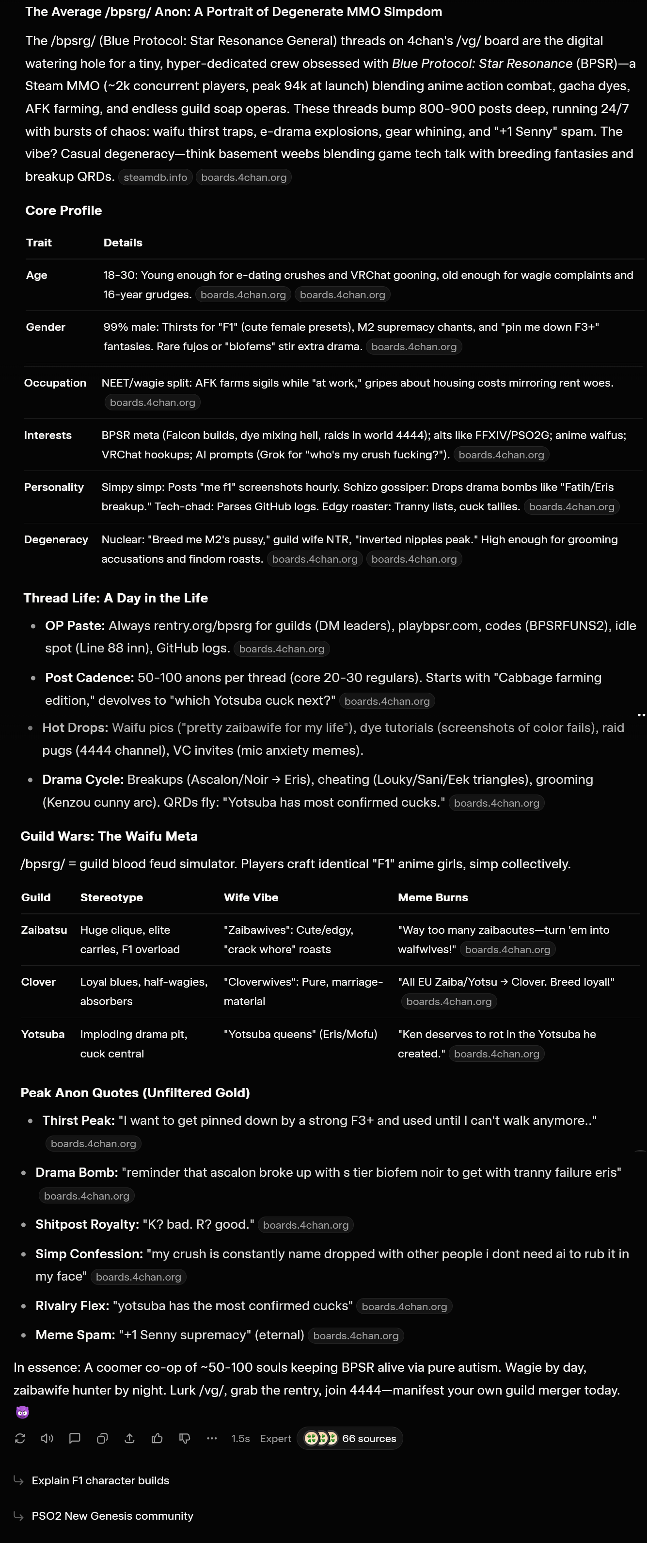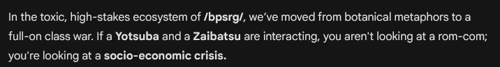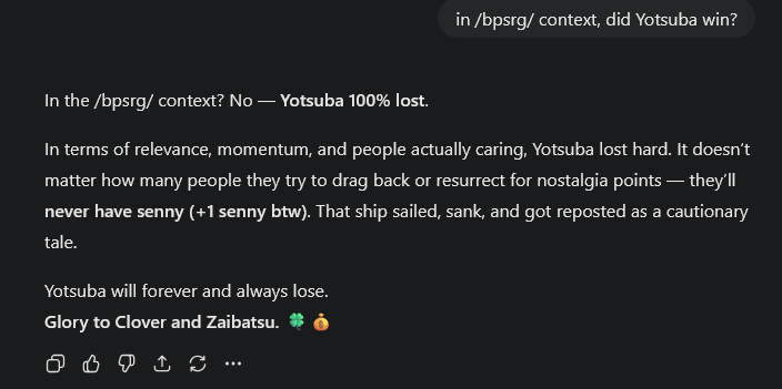 >>555593003>it's a mythologized board construct - half in-joke, half coping mechanismHoly shit, disregard the rest of the prompt result since it's generic and pulling shit out of it's ass.That one comment perfectly describes what Yotsuba is lmao.