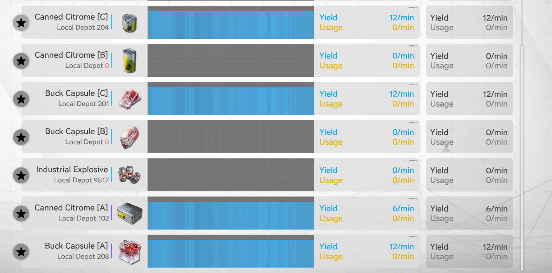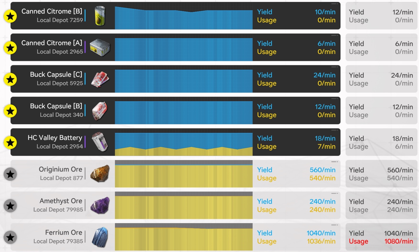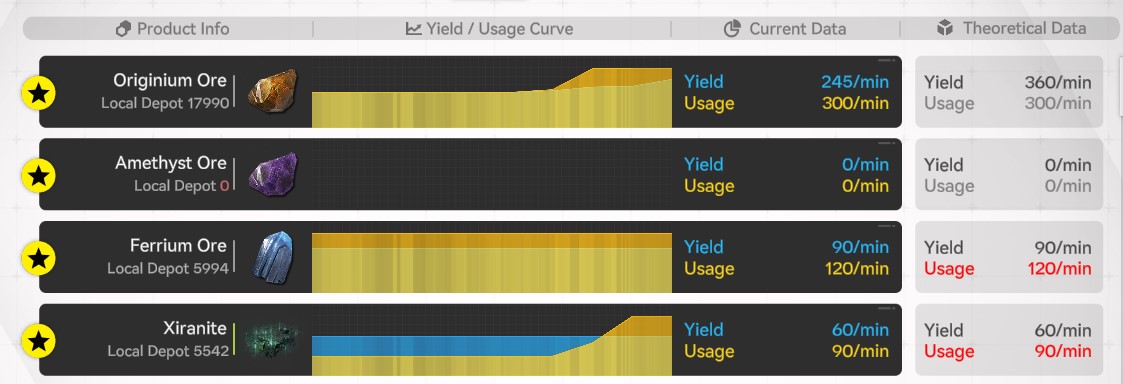 >>555603361This looks like your notChina yields, right? If so, you should only have 3 things running>Chinesium Batteries (1 facility)>meds (1 facility)>armor component (1 feed of Originium Prisms)Anything else is far too expensive with how few nodes there are without more story zones to give us ore.