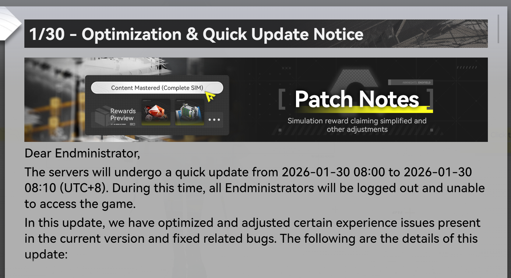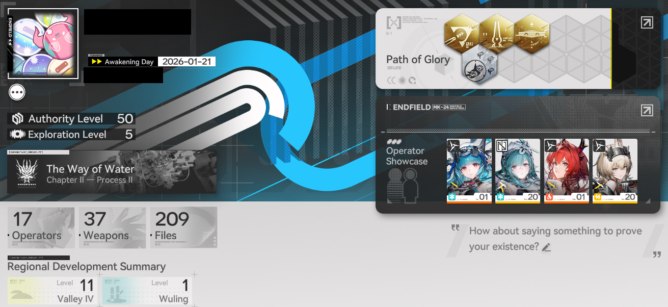 Previous thread: >>555594513>Official Websitehttps://endfield.gryphline.com/en-us>Official EN X (NEWS HERE)https://x.com/AKEndfield>Chartered Headhunting ScheduleJanuary 21st to February 7th --- "Scars of the Forge", (Laevatain)February 7th to February 24th --- "The Floaty Messenger", (Gilberta)February 24th to March 13th --- "Hues of Passion", (Yvonne)>Launch Reward Codes (Valid until January 29th)RETURNOFALLALLFIELDENDFIELDGIFTENDFIELD4PC>Twitch Dropshttps://endfield.gryphline.com/special/third-party-binding?channel=twitch>Voyage to the Stars (Ongoing until March 4th)https://endfield.gryphline.com/activity/voyage-to-the-stars/en-us/>Special Launch Streamhttps://www.youtube.com/watch?v=dz2g_D52NR0 [Embed] [Embed] [Embed]>Official Release Trailerhttps://www.youtube.com/watch?v=oJ00ggFb8A0 [Embed] [Embed] [Embed]>Official Release PV'shttps://www.youtube.com/watch?v=5Xm45NwWOlo [Embed] [Embed] [Embed]https://www.youtube.com/watch?v=UPpeeft1-8o [Embed] [Embed] [Embed]https://www.youtube.com/watch?v=tN80M6IEMo0 [Embed] [Embed] [Embed]>Wikishttps://wiki.skport.com/endfield (Official)https://perlica.moehttps://warfarin.wiki/enhttps://endfield.wiki.gg/>Blueprint Guideshttps://talospioneers.com/en>Stickershttps://drive.google.com/drive/folders/13KH3L6QPIKkVH7pBddv4uxwmwJsnOtklhttps://drive.google.com/drive/folders/1OuVtjv1k-9c3M6n7d4PX3CGG5bkwH04ahttps://drive.google.com/drive/folders/1AStB8bzFk3lSwMwczWPkFYCBrZe0vHOghttps://drive.google.com/drive/folders/1yS0lqUhxf8tBRtpDFfCU1y16IS2sSeF7>Fr/end/sSubmit your info, /end/min:https://forms.gle/Fo7BhZMKaKqiWyL19View other /end/mins:https://docs.google.com/spreadsheets/d/1YtxiDss0hgEQhLlZgpfzyGrJrzUcqDzOS9T6IH-BiVc/edit?usp=sharing