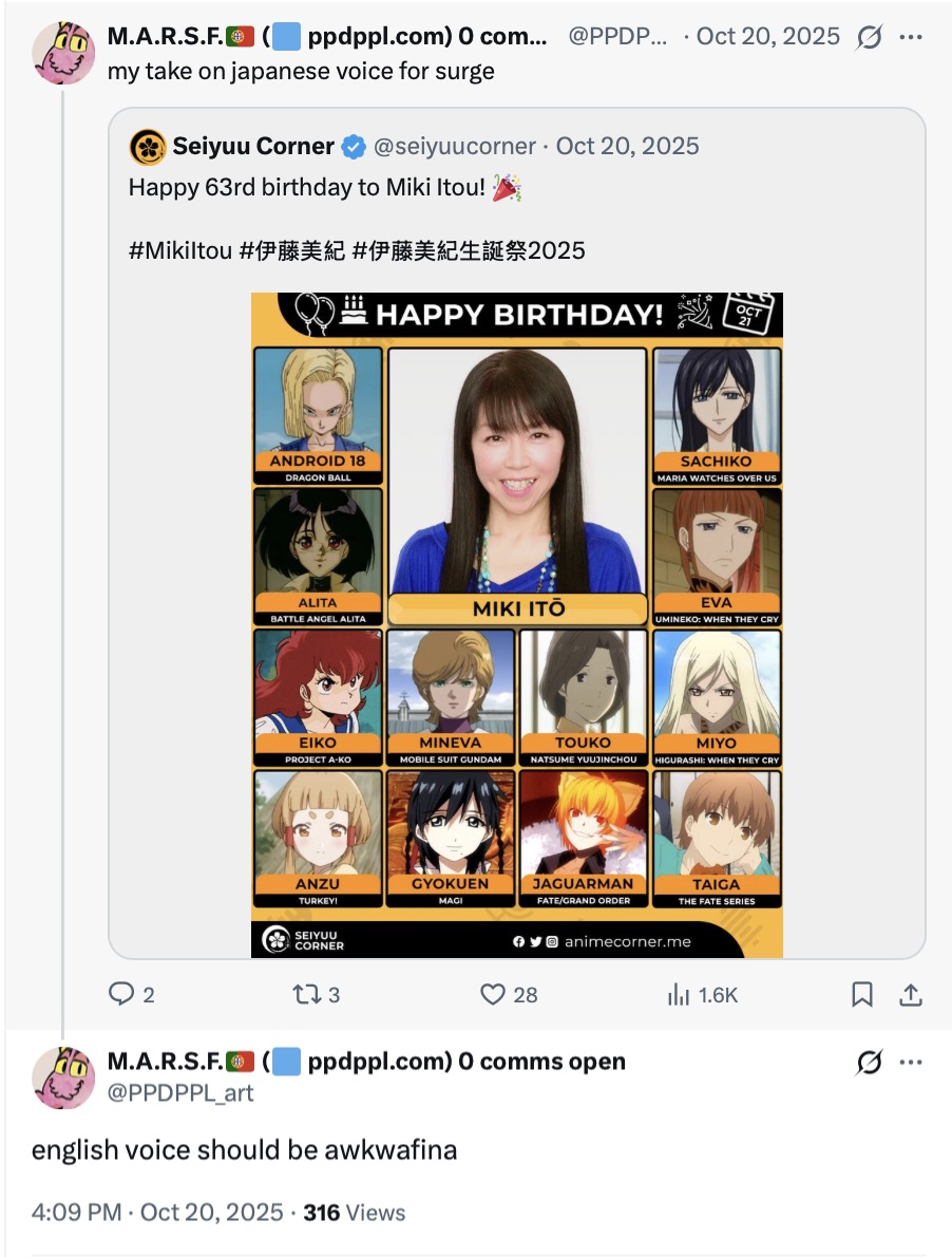 >>555640886>picRyuko Matoi's English VA being used as a voiceclaim for Surge is genius on the part of the Ring Racers devs