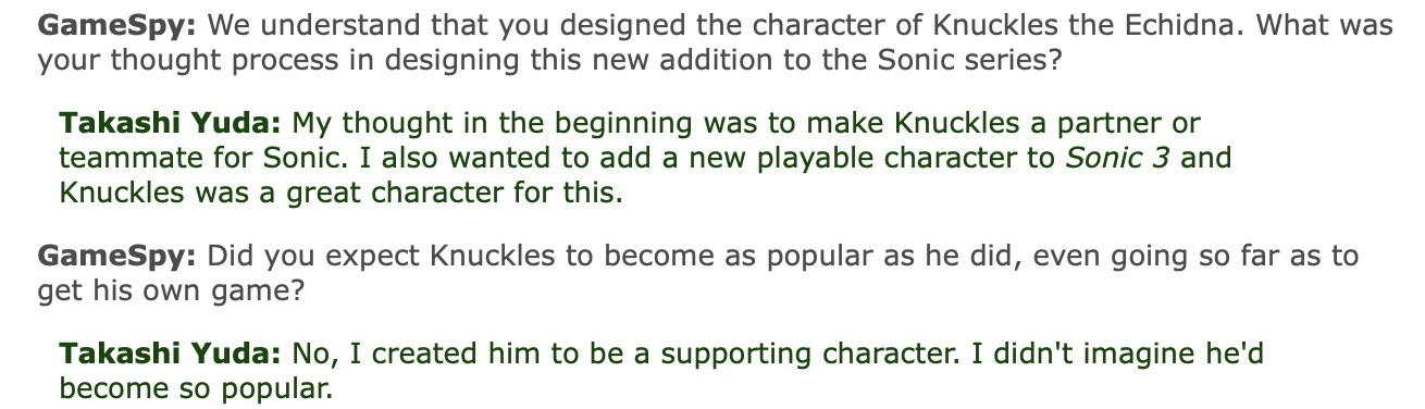 >>555638057I guess fans at that time saw Sonic more as a player avatar rather than a narrative protagonist. It makes sense because Sonic is the only character listed that doesn't have a backstory or set motivation outside of the scenario at hand in the game and during the dark age, all the characters kind of revolver around and react to him.