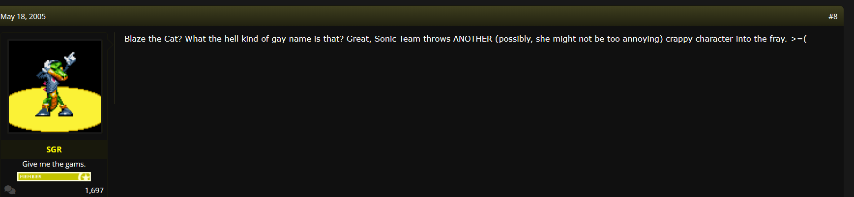 >>555640007>Sonic shouldn't be saving princessesThey are saying the later, a lot of people had an idea that Sonic should only have a specific type of story(more sci-fi like SA2) and believed Sonic in a fairytale setting like 06 didn't fit.>Sonic used to be stoic and badassI think this is because Modern Sonic is more affable(i.e. Heroes' "Let's blast through with Sonic Speed" Sonic) and most current fans grew up with this more affable and sincere Sonic.