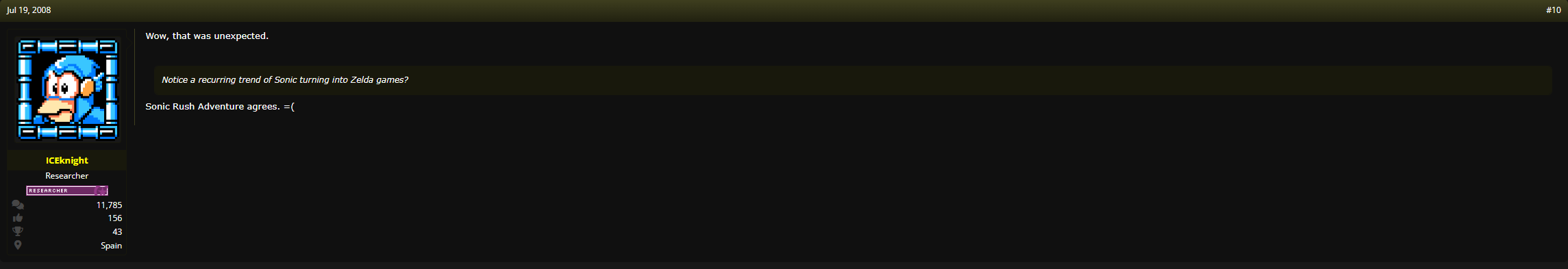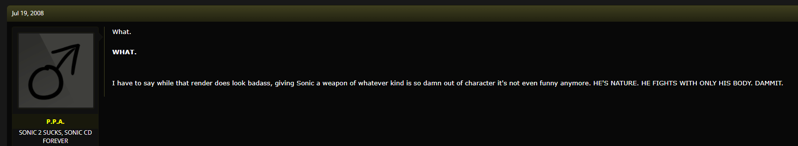 I've been watching a lot of old Sonic videos and I found it interesting how people rarely questioned Sonic's characterization before Colors. It's always Shadow, Amy, Knuckles, and Tails but not Sonic. There were some complaints about how he isn't cocky enough in 06 in some old reviews but you can always bank on that specific reviewer being a Satam boomer. In fact, Sonic's character is almost never discussed in old Sonic youtube videos. I have to go out of my way to find any mention of it. Shadow is HEAVILY discussed.