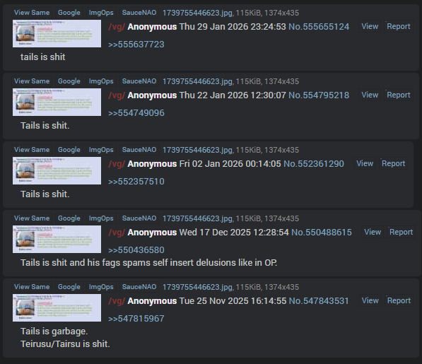 >>555665980>>555667071>>555667248>>555667505Didn't know people who dislike tails self inserting controlled your mind to be mindbroken this bad, kek. I didn't "last post" for like the last 10 or so threads, are you sweating this bad?