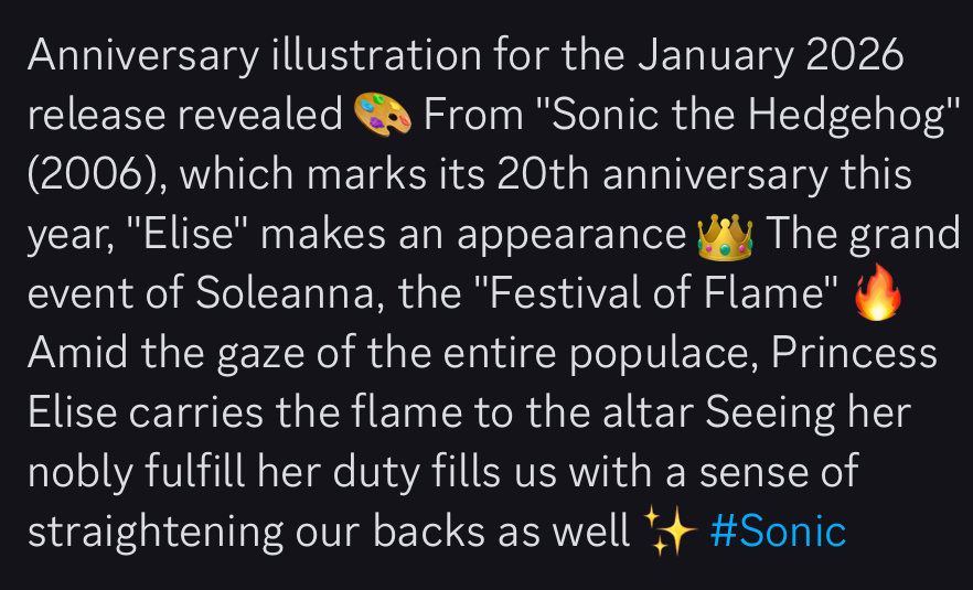 >>555639608>>555638195I should correct myself. You will sometimes see two types of characterization arguments brought up in old Sonic videos>Sonic shouldn't be saving princesses for romance, that's Mario's thing! Mario is lame!I don't really understand this one. Why wouldn't Sonic save Elise? Or are they saying Sonic should never be put in this situation. >Sonic used to be stoic and badass in the classic era and the modern games ruined him by turning him into a jokerthis one is ironic considering the current discourse about JP vs America. You never see this one anymore but it was definitely a thing.