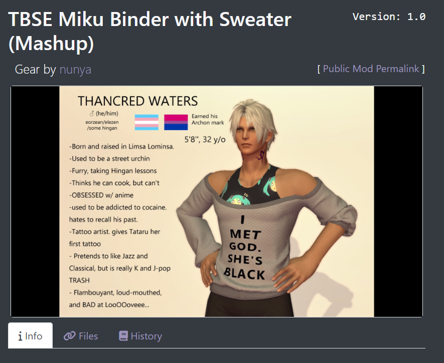 post your character wearing thishttps://www.xivmodarchive.com/modid/144724(it has two dye channels btw)