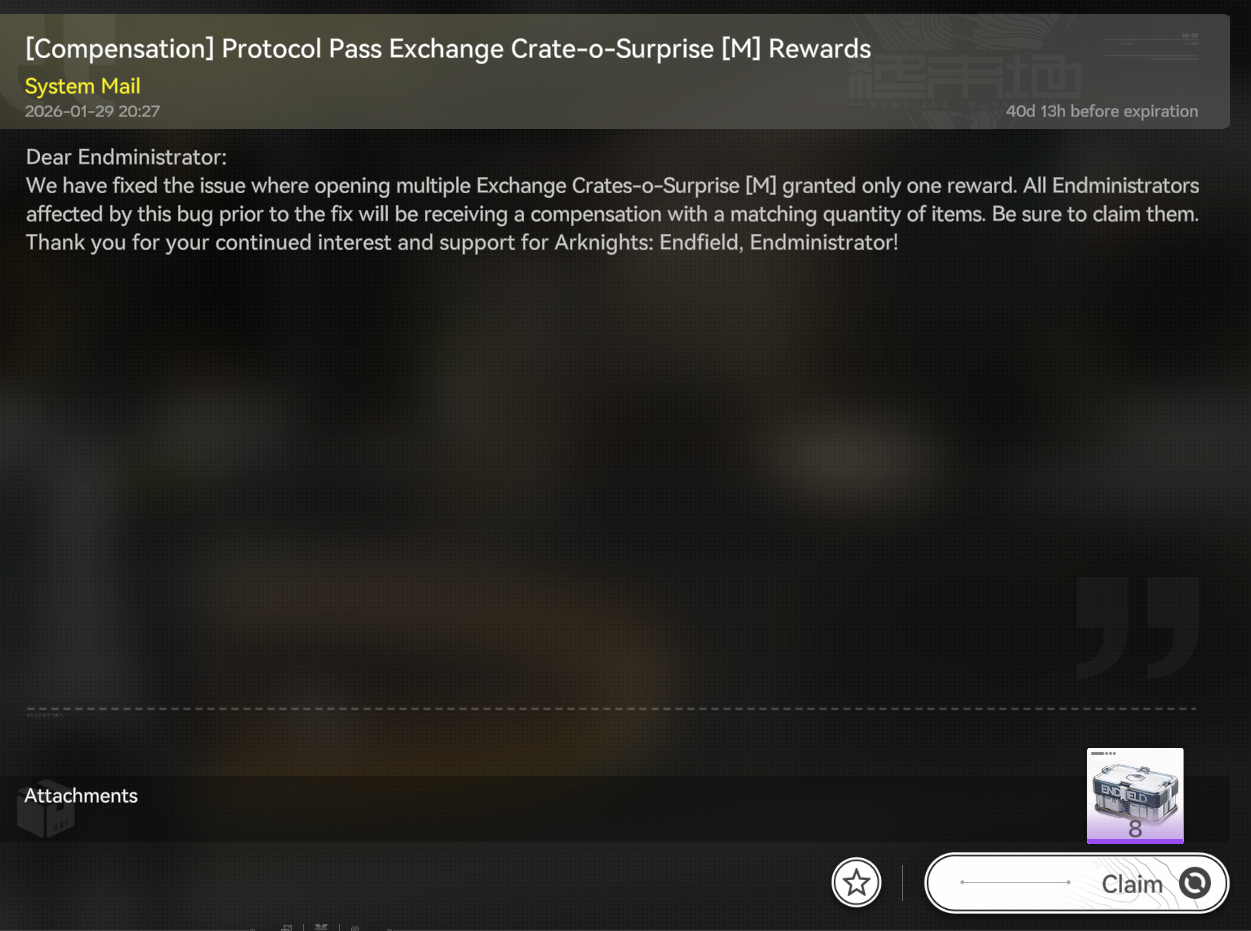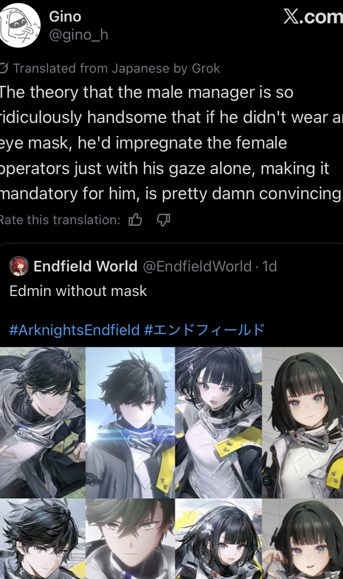 Previous thread: >>555643782>Official Websitehttps://endfield.gryphline.com/en-us>Official EN X (NEWS HERE)https://x.com/AKEndfield>Chartered Headhunting ScheduleJanuary 21st to February 7th --- "Scars of the Forge", (Laevatain)February 7th to February 24th --- "The Floaty Messenger", (Gilberta)February 24th to March 13th --- "Hues of Passion", (Yvonne)>Launch Reward Codes (Valid until January 29th)RETURNOFALLALLFIELDENDFIELDGIFTENDFIELD4PC>Twitch Dropshttps://endfield.gryphline.com/special/third-party-binding?channel=twitch>Voyage to the Stars (Ongoing until March 4th)https://endfield.gryphline.com/activity/voyage-to-the-stars/en-us/>Special Launch Streamhttps://www.youtube.com/watch?v=dz2g_D52NR0>Official Release Trailerhttps://www.youtube.com/watch?v=oJ00ggFb8A0>Official Release PV'shttps://www.youtube.com/watch?v=5Xm45NwWOlohttps://www.youtube.com/watch?v=UPpeeft1-8ohttps://www.youtube.com/watch?v=tN80M6IEMo0>Wikishttps://wiki.skport.com/endfield (Official)https://perlica.moehttps://warfarin.wiki/enhttps://endfield.wiki.gg/>Blueprint Guideshttps://talospioneers.com/en>Stickershttps://drive.google.com/drive/folders/13KH3L6QPIKkVH7pBddv4uxwmwJsnOtklhttps://drive.google.com/drive/folders/1OuVtjv1k-9c3M6n7d4PX3CGG5bkwH04ahttps://drive.google.com/drive/folders/1AStB8bzFk3lSwMwczWPkFYCBrZe0vHOghttps://drive.google.com/drive/folders/1yS0lqUhxf8tBRtpDFfCU1y16IS2sSeF7>Fr/end/sSubmit your info, /end/min:https://forms.gle/Fo7BhZMKaKqiWyL19View other /end/mins:https://docs.google.com/spreadsheets/d/1YtxiDss0hgEQhLlZgpfzyGrJrzUcqDzOS9T6IH-BiVc/edit?usp=sharing