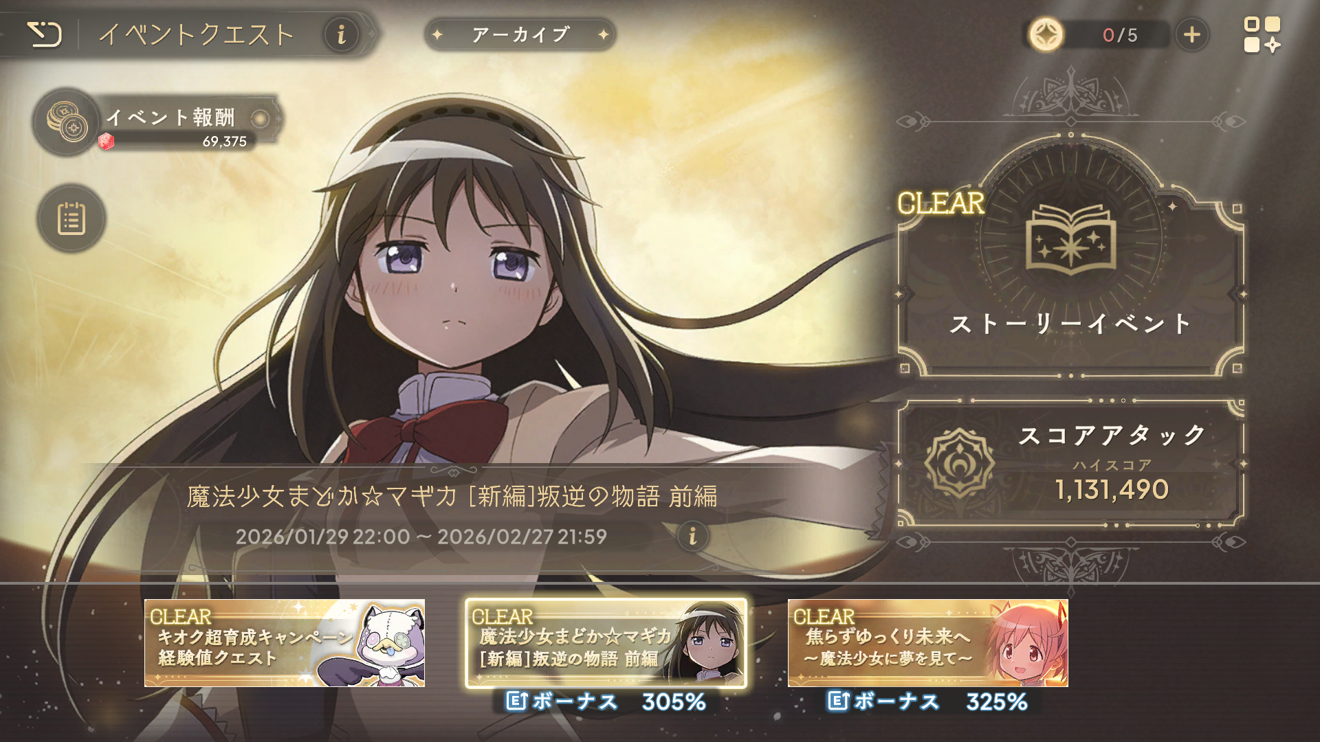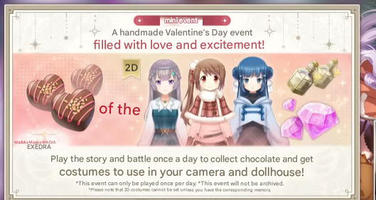 Previous:>>555117828>Magia Exedra Guide and FAQhttps://rentry.co/madoranightmarehttps://docs.google.com/spreadsheets/d/e/2PACX-1vSmMCjLn52tBVzDa-iaHhIGxpANKJUcRiB3yqkZSSUwYmOaH5-hvxCx4xjIMDm0GOUO7pdXDHCoA8zF/pubhtml#>Exedra on Steam, Google Play, App Storehttps://store.steampowered.com/app/2987800/Madoka_Magica_Magia_Exedra/https://play.google.com/store/apps/details?id=com.aniplex.magia.exedra.enhttps://apps.apple.com/us/app/madoka-magica-magia-exedra/id6480402391>NewsExedra Special News #20https://www.youtube.com/watch?v=E0pIedyVtXgRadio Exedra #23 (8/2 10:30 UTC)https://x.com/radio_exedra/status/2016131576287891513>Campaign>Rebellion Release CelebrationMain Quest Full Clear Missions (30/1 03:00 – 28/2 02:59 UTC)Main Quest Easy Mode (Standard Only) (30/1 03:00 – 28/2 02:59 UTC)Bebe Camera (30/1 03:00 – 28/2 02:59 UTC)Kioku Super Training MissionsPart 1 (30/1 03:00 – 8/2 02:59 UTC)Part 2 (8/2 03:00 – 18/2 02:59 UTC)Part 3 (18/2 03:00 – 28/2 02:59 UTC)Chaos Mode Challenge Missions (30/1 03:00 – 31/3 02:59 UTC)Invite-a-Friend Campaign (28/1 03:00 – 28/2 02:59 UTC)>EventRebellion: Part 1 (30/1 03:00 – 28/2 02:59 UTC)Score Attack vs Yaginoko no YumeNext Act: In Search of an Ordinary Life (19/1 03:00 – 2/2 02:59 UTC)Score Attack vs Sneedle WitchKioku Super Training (30/1 03:00 – 28/2 02:59 UTC)Player Match Season #22 (19/1 03:00 – 1/2 19:59 UTC)Link Raid vs Sandbox Witch (29/1 03:00 – 12/2 02:59 UTC)>Gacha>Homucifer Fate Weave (30/1 03:00 – 28/2 02:59 UTC)5* Akuma Homura (Falsified Phenomena)>Koito Fate Weave (19/1 03:00 – 2/2 02:59 UTC)5* Koito (Soaring Storyteller)>Daily x10 Free Roll (100 roll limit) (28/1 03:00 – 28/2 02:59 UTC)