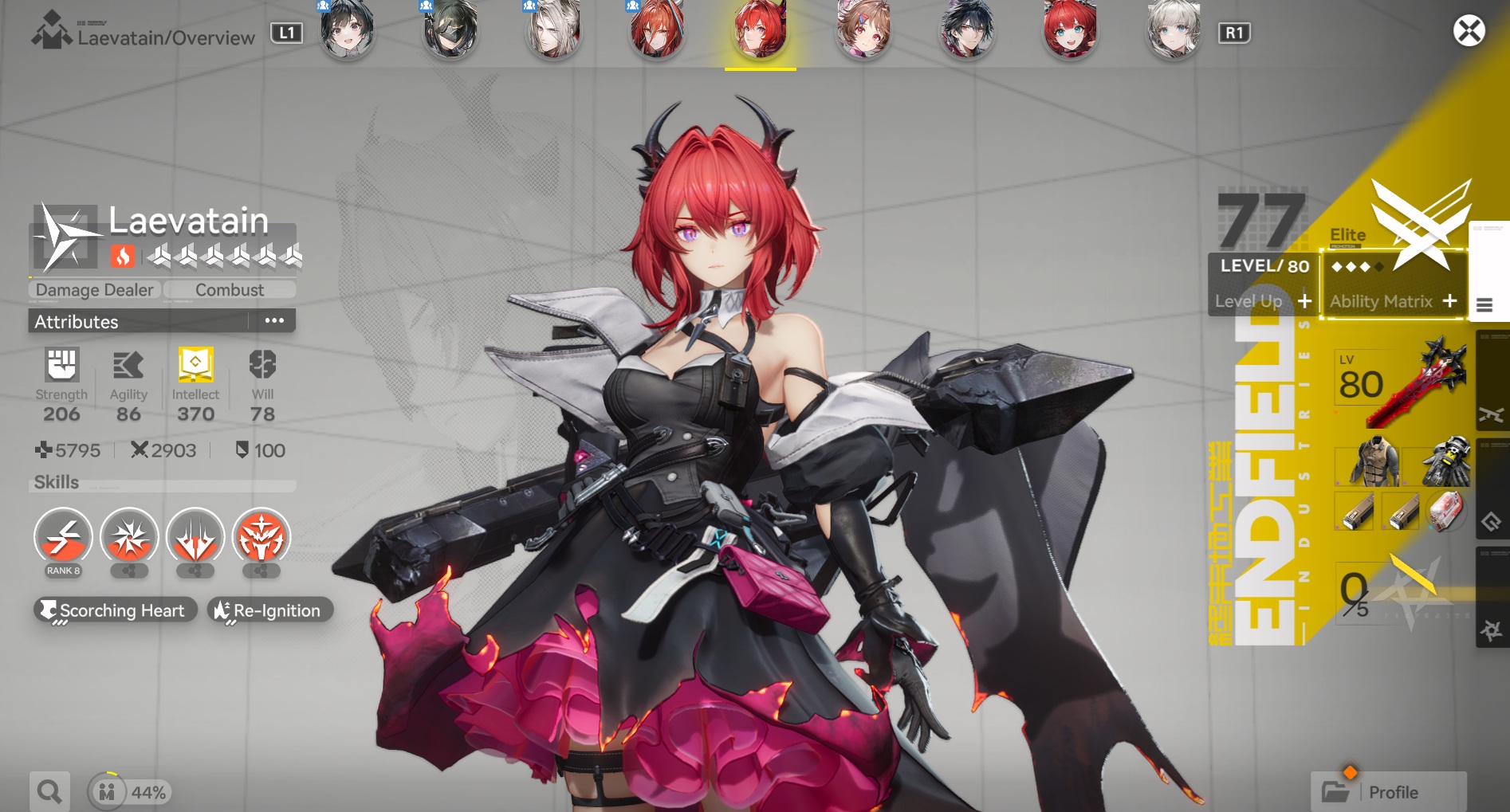 >play highest skill level item stage with Laeva lvl 77/80 and sig weapon lvl 80 and mostly lvl 9 skills, other chars are 60/60 with lvl 4 to 5 skills>Barely make it within the time limit>play phys team with lvl 70/70, half have lvl 5 skills, the other half has lvl 4 skills (it's why I do this)>minute to spareI love my Chen, and her team with End, Pog and Ember is fun to play, but man. I pumped everything into Laeva because I figured she'd be performing the best while her supports "matter little" for damage anyways.And no I don't have gold sets for extra stagger. That would be good here I guess. Still rolling on purple. Guess I go all into phys now? I wanted to raise her friends a little after this, but...