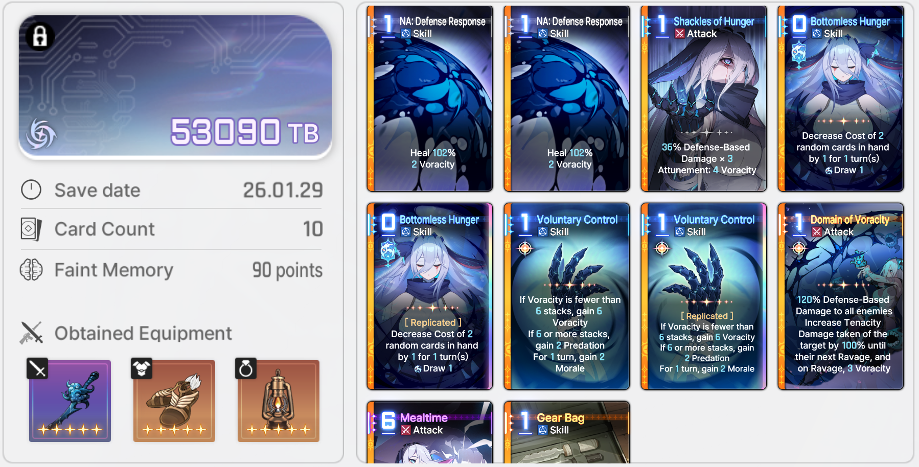 >>555704648>>555710432Holy shit Wanderer of the Void is a godsend. I’m at floor 70 now. Draw that in the 5th node and you can circumvent most of the bullshit a boss will throw at you. No wonder they are gonna nerf this.